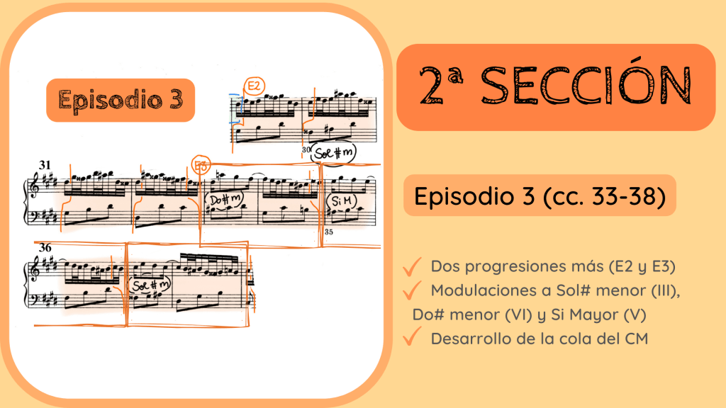 Tonalmente volvemos a modular. En el c. 33 aparece el Si# acompañado de un La becuadro lo que nos sitúa en Do# menor, el VI de la tonalidad principal. O, lo que es lo mismo, la tonalidad relativa de Mi Mayor. En la repetición del modelo, dos compases después, el La pasa a ser La# como sensible de Si Mayor, otra vez la tonalidad de la dominante. Y en la segunda repetición del modelo reaparece la tonalidad de Sol# menor.