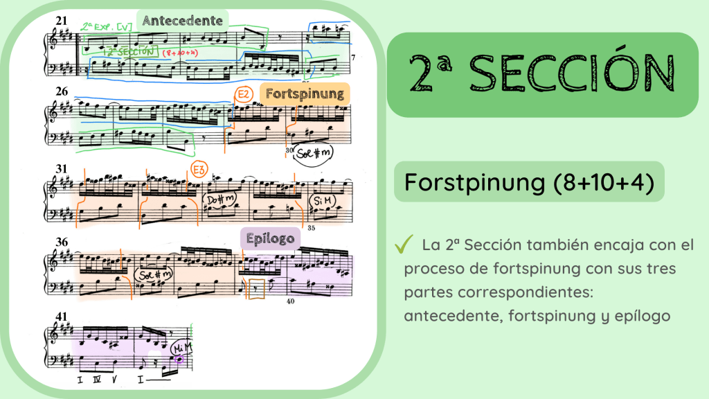 Efectivamente, con el fortspinung. Aunque las proporciones son distintas volvemos a contar con los ingredientes necesarios: un antecedente como primera parte expositiva, la Exposición n.º 2 en Si Mayor; un fortspinung formado por progresiones (los Episodios 2 y 3) con función transitiva o de desarrollo; y el epílogo como parte conclusiva con el punto cadencial sobre Sol# menor.