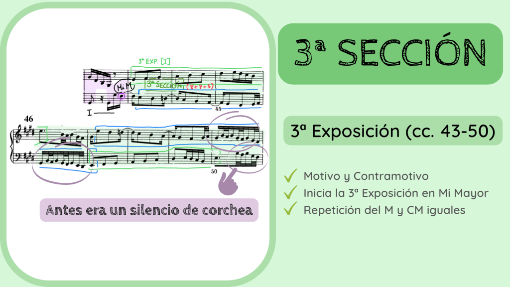 De esta manera da inicio la 3ª SECCIÓN que hace las veces de una reexposición ya que se vuelven a escuchar el motivo y el contramotivo en el tono original de Mi Mayor. Pero ojo, que nadie piense que esto va a pasar siempre, me refiero al hecho de que tengamos una Exposición, en este caso la n.º 3, en el tono principal. Podría perfectamente no existir esta idea de reexposición a la hora de analizar la invención.