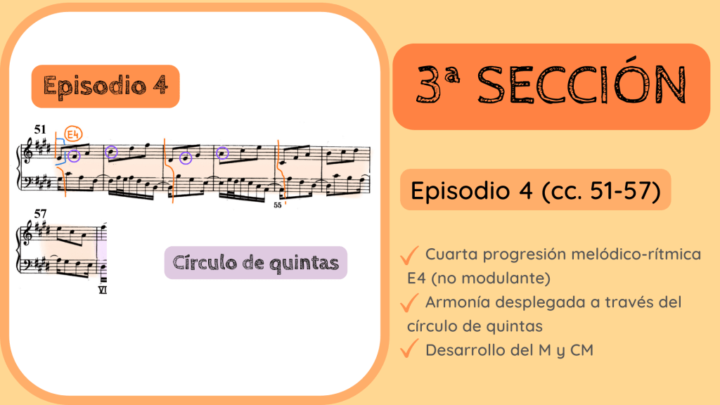 La siguiente progresión da paso al Episodio 3. Aparece una vez el modelo y éste se repite dos veces. Ahora sí que parece que la progresión es melódico-armónica ya que se repiten todos los elementos iguales, al menos entre la segunda y tercera repetición. De la primera a la segunda varía un poco la voz inferior.