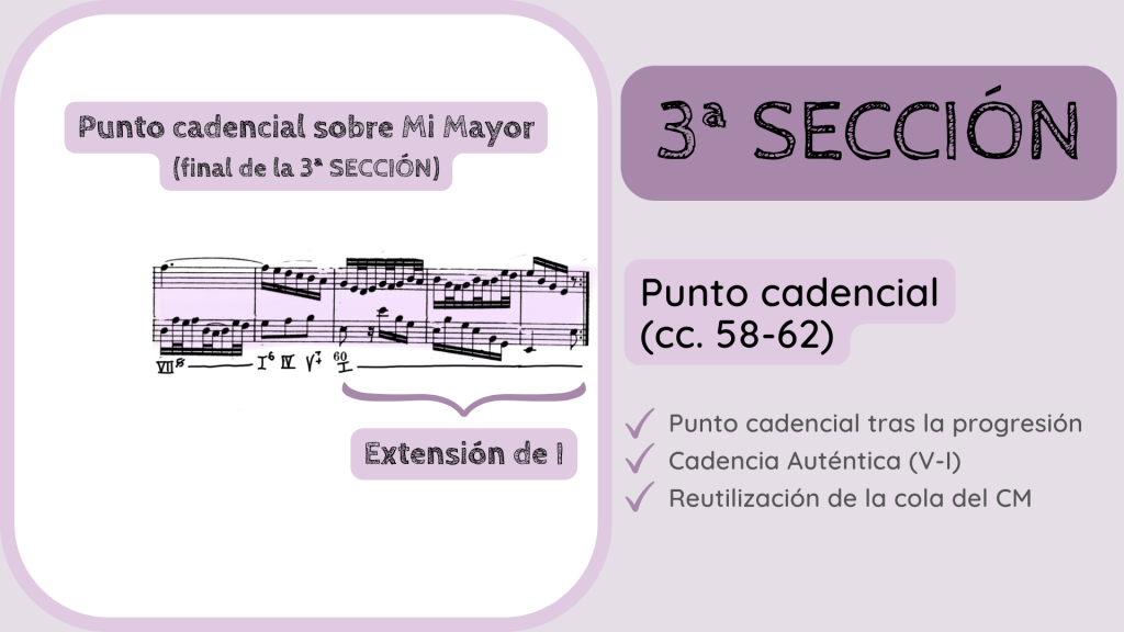 Y cómo no, para terminar de ser simétrica en cuanto a su estructura, la invención termina con otro punto cadencial que va a concluir tanto la 3ª Sección como toda la obra. De hecho, sus características son las mismas que las vistas en la 1ª Sección de entre las que destacan que se reutiliza el arpegio con floreos de la cola del contramotivo.