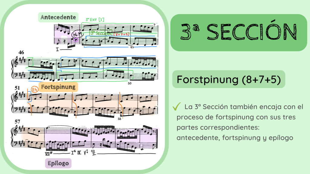Y, oh! Vaya sorpresa. De nuevo el proceso de fortspinung encaja con la 3ª Sección. Cabe decir a estas alturas que esta invención es probablemente una de las más simétricas, “rigurosas” y “fáciles” de encajar en una estructura ordenada. Pero veremos más adelante, en futuros análisis de otras invenciones, que éstas no tienen por qué ser tan rigurosas con el orden de los elementos que las constituyen. Es decir, que puede que una sección esté formada por solamente episodios, sin tener ninguna exposición. O que no exista una exposición última que vuelva a la tonalidad principal. Recordad que la invención es un género musical con una estructura libre.