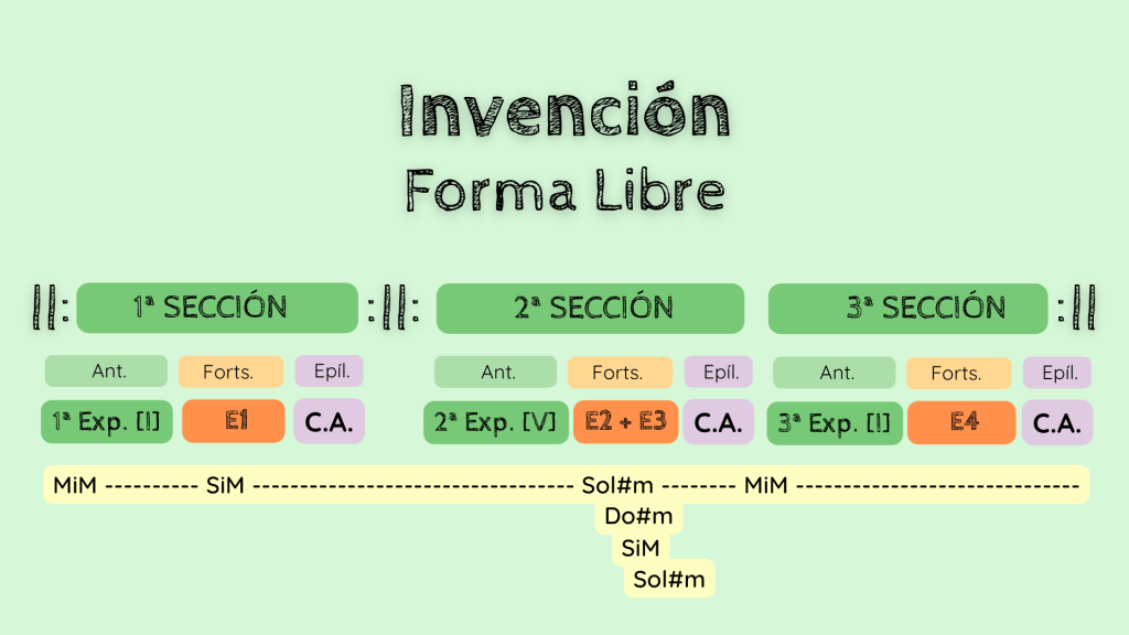 Para finalizar, como siempre, os dejo con el esquema formal de la obra. Ahí se ve la simetría y rigurosidad de esta invención en cuanto al orden de exposición, episodios y puntos cadenciales cumpliendo, en cada una de las tres secciones, el proceso barroco de fortspinung. Pero insisto, la estructura es libre. Es por ello que mi intención en este vídeo es que quede claro que las invenciones se construyen en base a dos elementos melódico-rítmicos: motivo y contramotivo. Y en base a la forma y función con las que aparecen sepáis determinar si exponen en una tonalidad con sus formas originales (exposiciones) o si se desarrollan a través de progresiones (episodios). Así es como podréis ir definiendo la forma de la invención. Las secciones dependerán de los puntos cadenciales. Por lo tanto, en este género debemos estar abiertos ante cualquier posibilidad estructural pero siempre guiándonos por los puntos cadenciales para definir, en un primer nivel las secciones y, dentro de éstas, si tenemos exposiciones, episodios o puntos cadenciales.