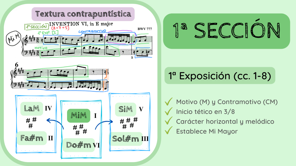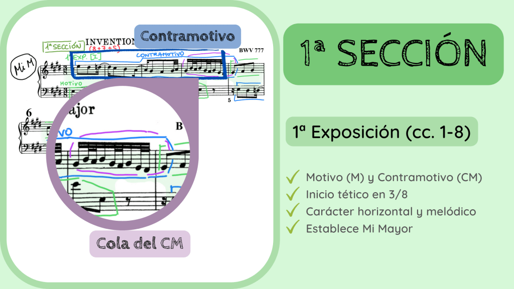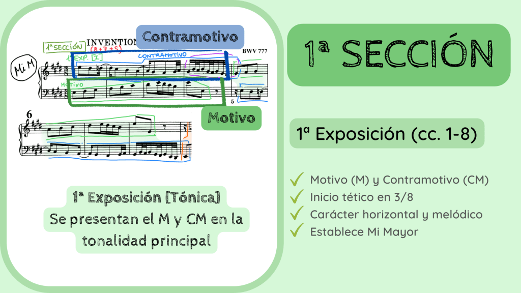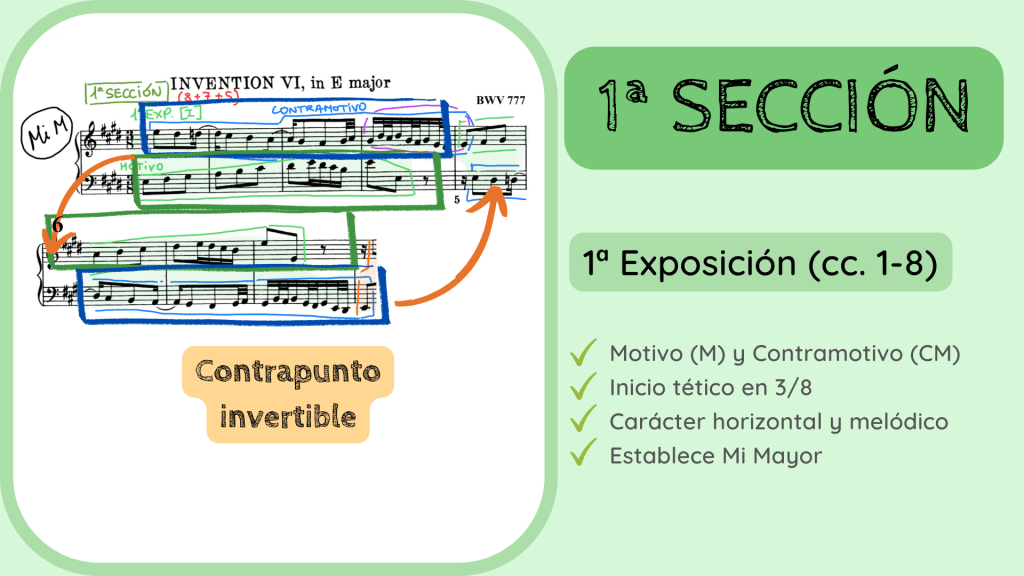 Como el objetivo es presentar estos elementos melódicos esta primera sección de la invención es una exposición. Recuerdo que la invención, en cuanto a su estructura, es la sucesión de exposiciones, episodios y puntos cadenciales asique en el análisis los vamos a ir numerando. Estamos ante la Exposición n.º 1 y en la tonalidad principal de Mi Mayor. Es importante marcar en que tonalidad con respecto a la principal se está produciendo la exposición ya que puede haber desde una hasta varias exposiciones.