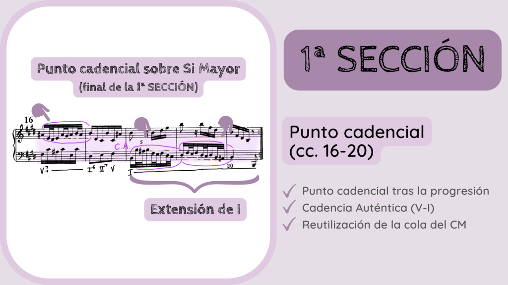Tras la progresión, el discurso musical nos conduce al punto cadencial que se produce exactamente entre los cc. 17-18 en forma de Cadencia Auténtica. Los puntos cadenciales son momentos en los que Bach verticaliza la música con textura que tiende a la homofónica y añade elementos melódicos característicos como trinos sobre el II o anticipaciones de Tónica. Como veis se verticaliza en este caso el c. 17 y se produce la Cadencia Auténtica sobre la tonalidad que ya se había asentado en el Episodio 1 de Si Mayor, la dominante de la tonalidad principal. ¿Os acordáis del acorde de tónica desplegado al final del CM, lo que habíamos denominado como cola? Pues aquí está de nuevo. Mantiene esa idea de acorde desplegado con bordaduras o floreos y, por supuesto, tiene esa función cadencial. Es por ello que la 1ª Sección termina aquí. Además, su final está doblemente marcado por la cadencia y por la doble barra de repetición.