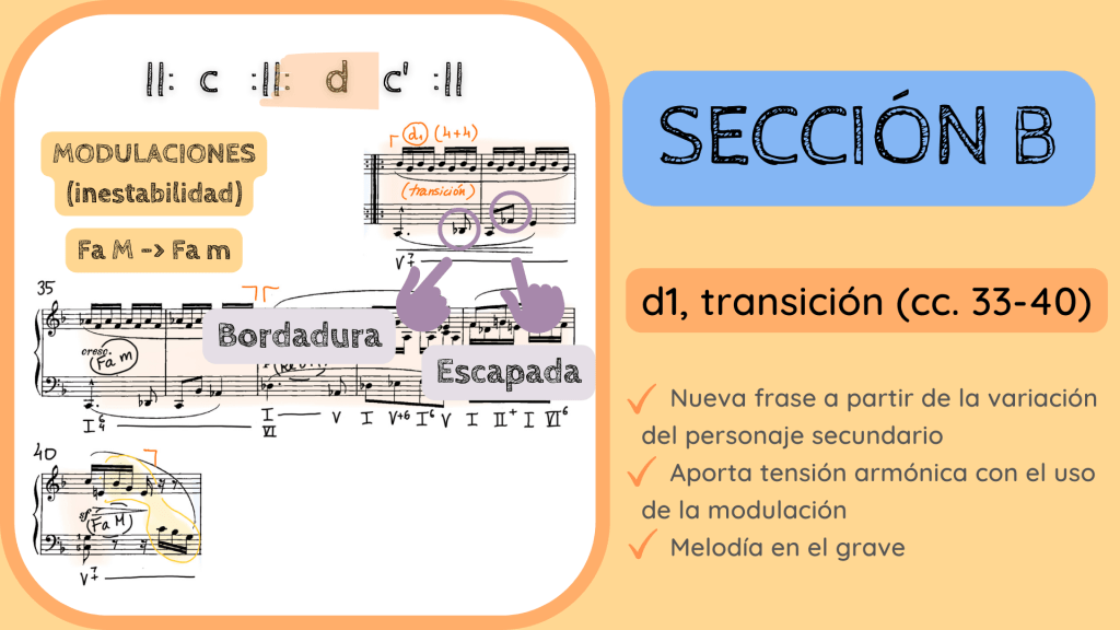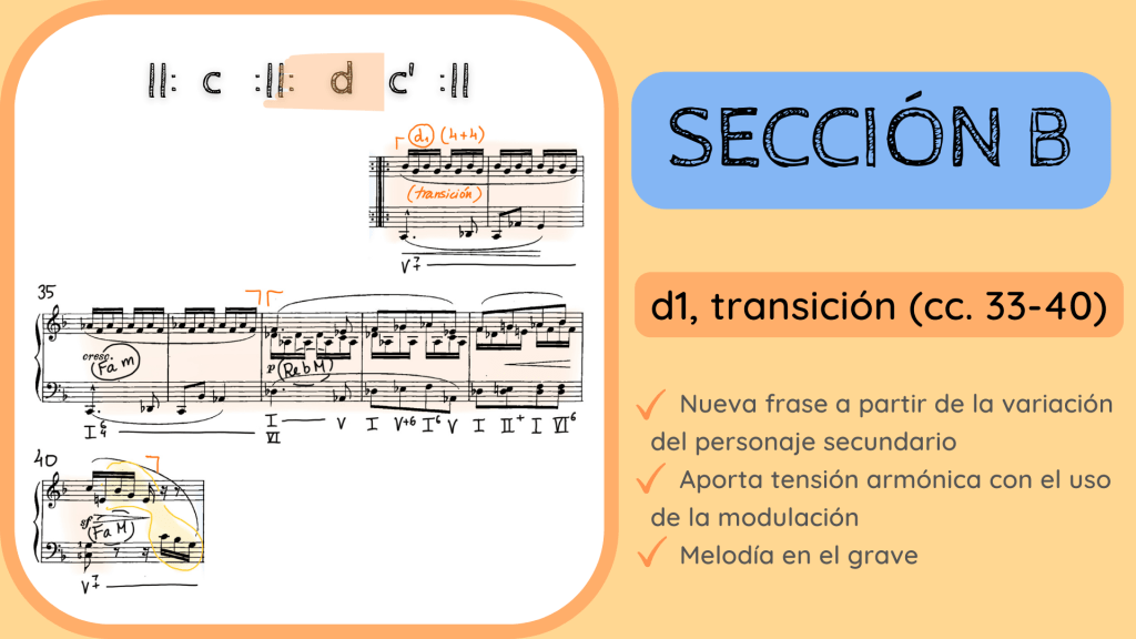 Pasamos la doble barra y entramos en la frase d1 que hace su función transitiva de la siguiente estructura binaria recapitulada, la que hemos dicho de la Sección B. Recordad que tenéis arriba de la diapositiva el esquema de la estructura. Esta nueva frase presenta algunas de las características que habíamos visto antes en la frase b1, que también separaba el personaje principal de su repetición. Vamos a mencionar esas características una por una.