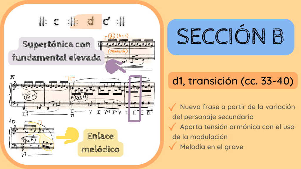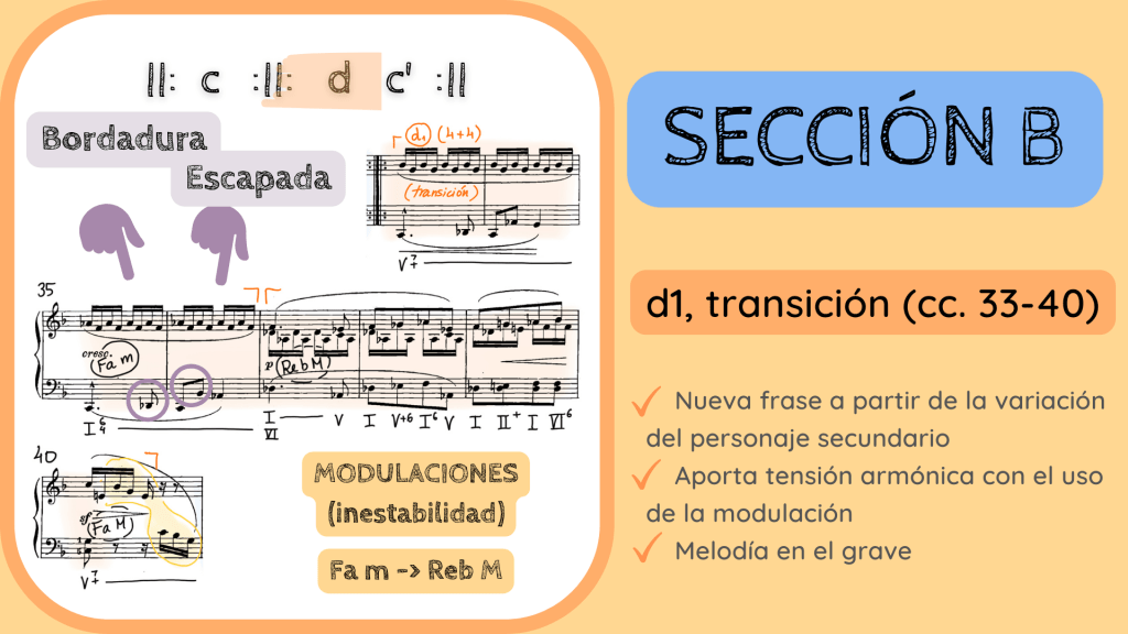 De la misma manera surgen las notas de adorno de los cc. 35-36. Y la armonía ahora se mueve hacia la tonalidad de Reb Mayor, vecina de Fa menor. Una relación mediántica ya que están a distancia de 3ª entre ellas (que no es lo mismo que tonalidades relativas, la relación mediántica es un concepto mucho más amplio que establece conexiones entre tonalidades que pueden ser vecinas pero también lejanas). La nueva tonalidad se inicia con la semifrase que hace de consecuente y presenta un ritmo armónico aún más acelerado que la frase c1. Dicha frase finaliza en una semicadencia cuya resolución nos llevará de nuevo a la reexposición de la c1’.