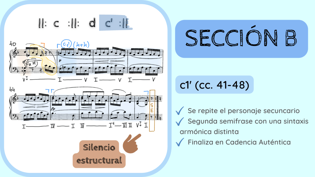 Como era esperable, se reexpone la frase c1, la que es el personaje principal de la Sección B. La primera semifrase es igual que la original pero la segunda semifrase, el consecuente, reutiliza material de la frase anterior d1. Con el silencio estructural después de la cadencia Auténtica se pone punto y final a la Sección B. Tanto la frase c1 y d1 se volverán a escuchar ya que se repiten por la doble barra de repetición y, después, la música nos conducirá, de nuevo, al material melódico inicial de a1.