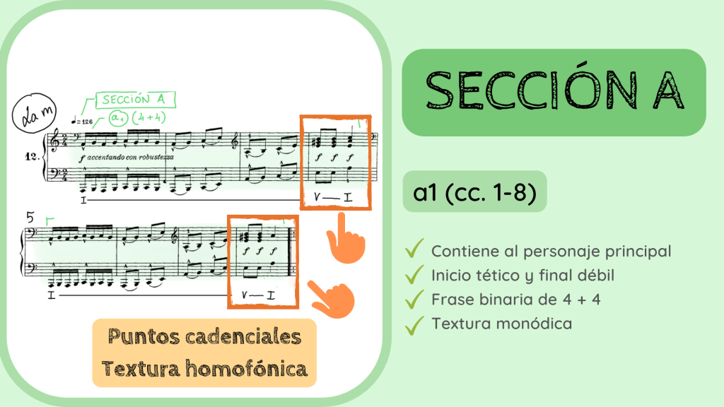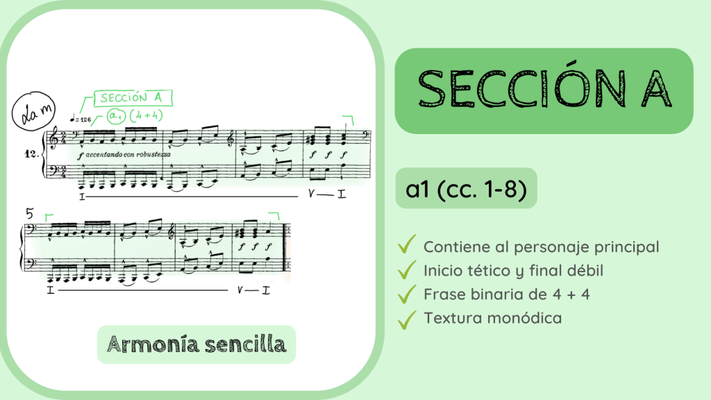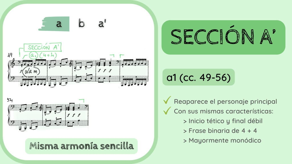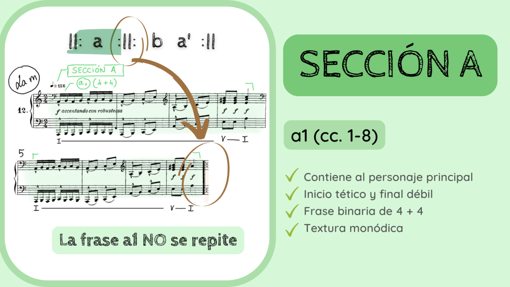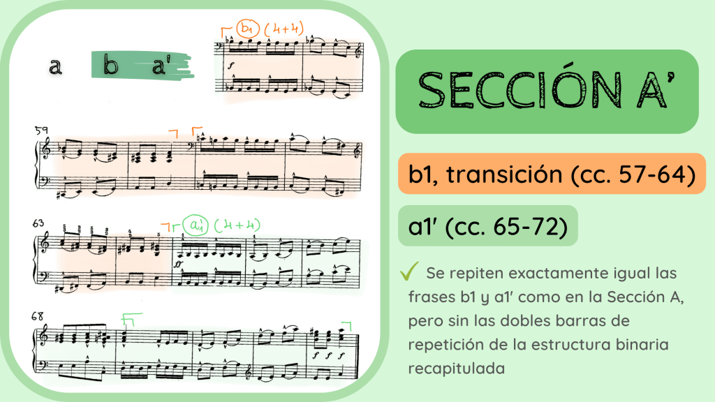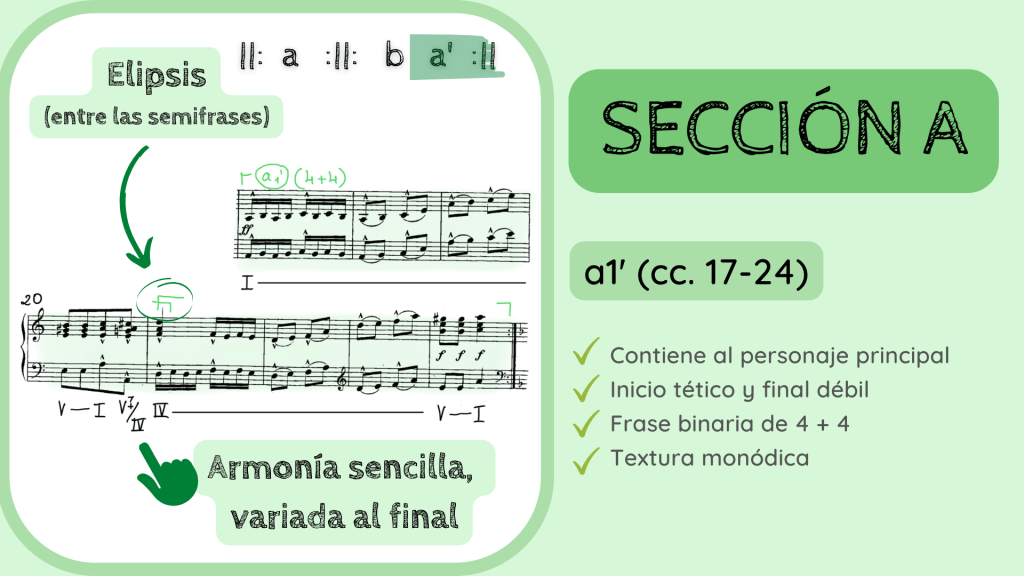 Y ahora la última confinación de que estábamos en lo cierto con la estructura Binaria Recapitulada: la reexposición de la frase a1. Se vuelve a escuchar de forma literal en los primeros tres compases. Como habréis apreciado, existe una pequeña variación hacia el c. 20 ya que surge, como de forma inesperada, una dominante del IV para, en la siguiente frase hacer un gran acorde desplegado de subdominante que acabará resolviendo sobre el V y luego I. Haciendo, por tanto, el proceso cadencial que finaliza esta primera gran Sección A que, en su interior, escondía una forma Binaria Recapitulada.