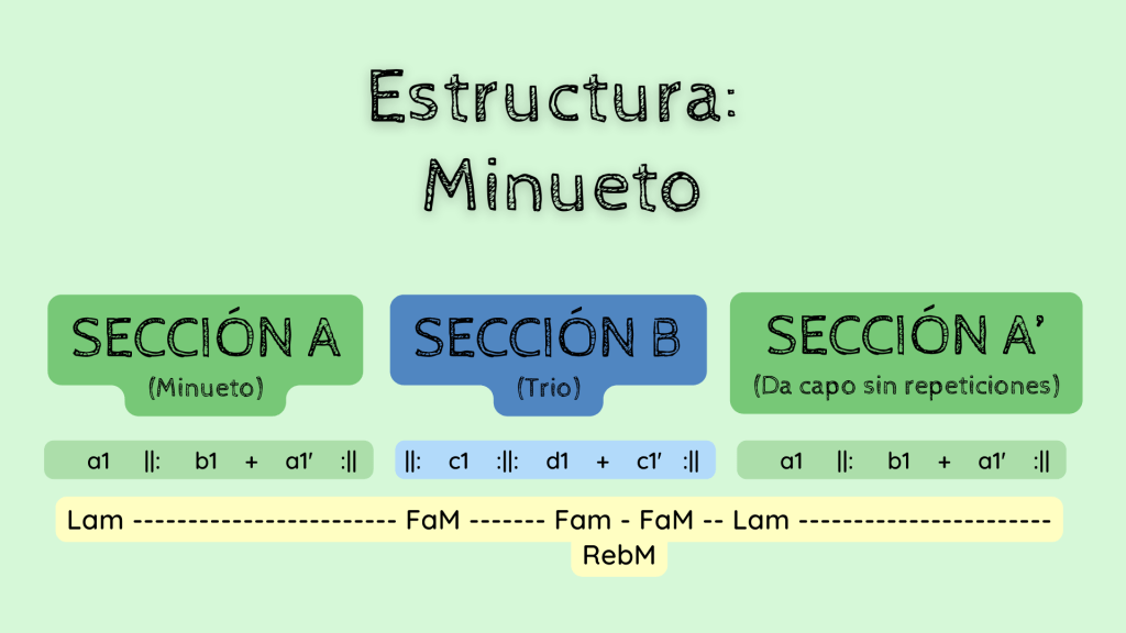 Esta estructura se caracteriza por presentar dos secciones divididas por la tonalidad y el carácter. Por un lado está lo que sería el minueto, en este caso la Sección A en La menor, enérgica y muy dinámica. Por otro lado tenemos la Sección B que sería el trío. Está en Fa Mayor y es una parte más calmada e íntima. La última sección A’ no es más que una da capo sin repeticiones de la Sección A. Es muy importante que, siempre y cuando aparezcan en una obra, prestéis atención a las dobles barras de repetición ya que, al igual que los silencios, son elementos clave para entender la estructura.