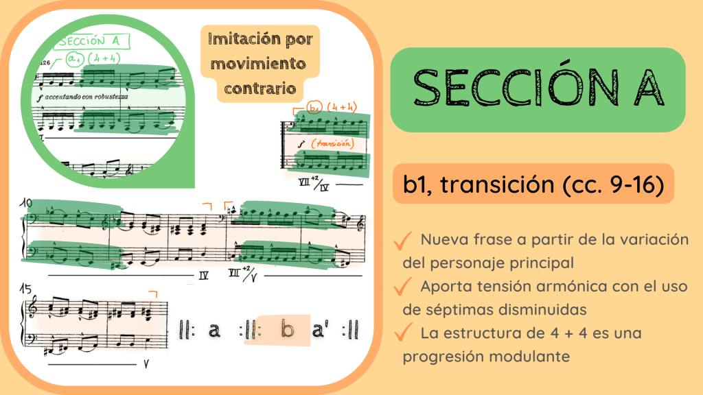 Y aquí tenéis otro argumento para concluir que esta primera Sección A es en realidad en su interior una Binaria Recapitulada. Resulta que esta nueva frase es de carácter de transición y que varía los elementos de la frase anterior a1. Como podéis observar la frase se crea, básicamente, a partir del movimiento contrario de los compases iniciales. Estamos por lo tanto en la frase b de la Binaria Recapitulada. Como se observa debajo de la diapositiva, en el esquema de la forma, estaríamos en la frases b, después de la doble barra.