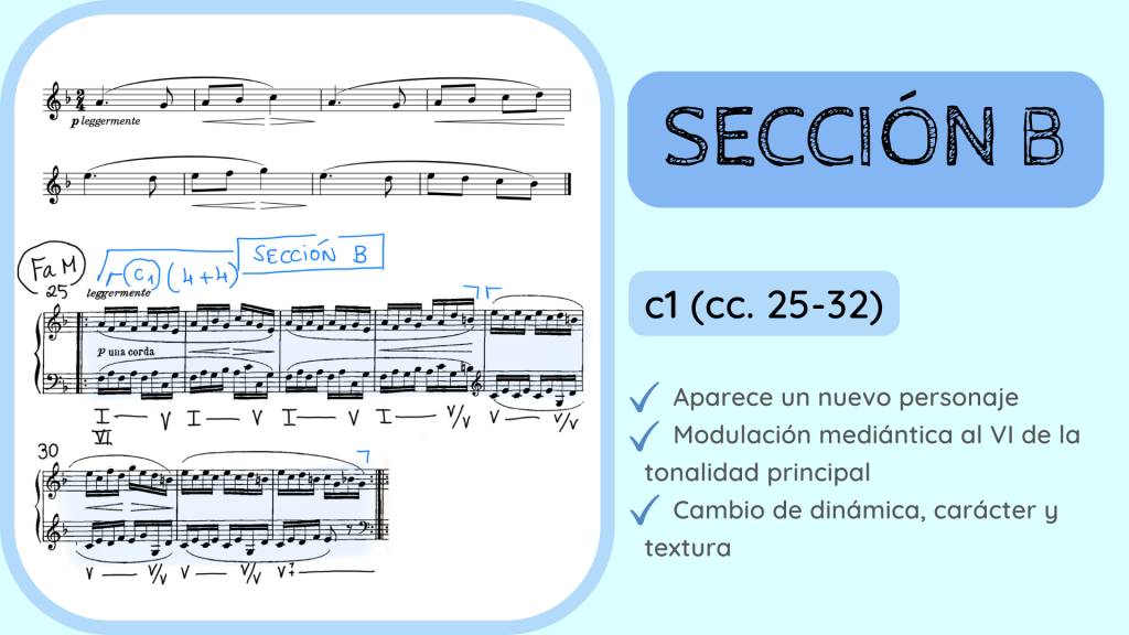 Pasamos ahora a la siguiente gran parte de la pieza que es la Sección B. Confirmado queda ya que, nada más empezar se establece una nueva armadura con un bemol, de Fa Mayor y el Sol# que hacía de sensible de La menor desaparece. Tonalidad nueva, sección nueva y, por lo tanto, personaje melódico-rítmico nuevo. Y así es, vamos a escucharlo.