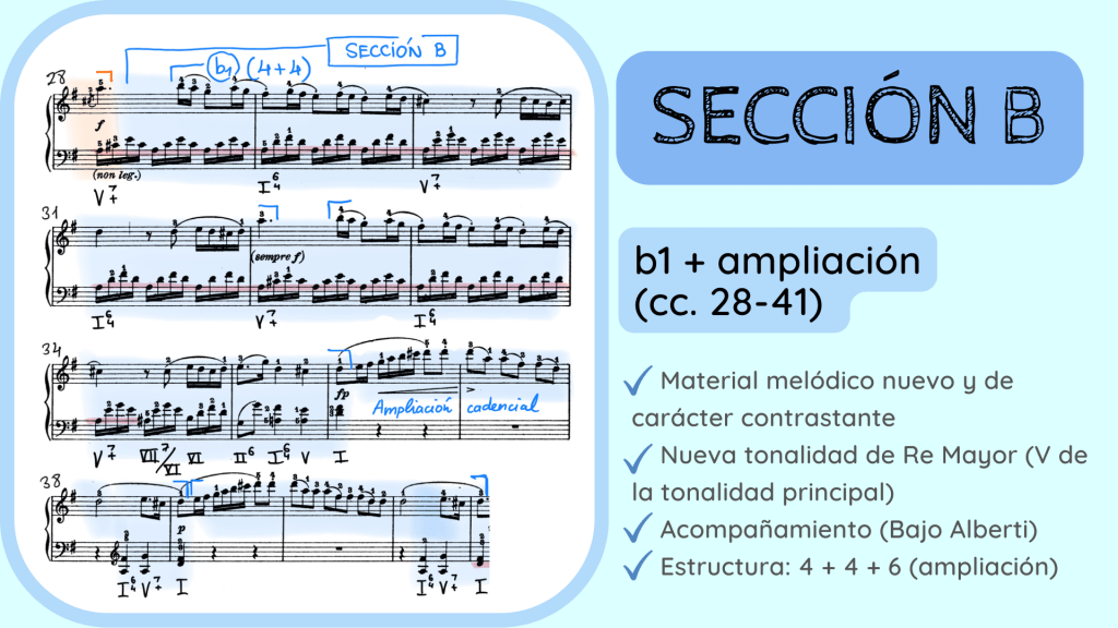 Si repasamos la armonía de ese fragmento tenemos en el c. 34 una dominante, que se transforma con el La# en el bajo en una Séptima Disminuida del VI, de Si. Es decir, una dominante secundaria. Ésta resuelve donde se esperaba, en el VI. Y en el c. 35 tenemos, de libro, el proceso cadencial habitual con una subdominante, una sexta y cuarta cadencial y por fin su resolución en tónica en el c. 36. Pero, ¿qué ocurre ahora? La frase no termina ahí. Se inicia otro fragmento que en principio es nuevo pero éste, por sí solo, no tiene ninguna característica melódica, rítmica o armónica destacable. De hecho armónicamente repite el V-I y es un pasaje mayormente melódico, sin acompañamiento. Es por ello que los seis compases, del 36 al 41, los he denominado como ampliación. No son una frase nueva de la sección B sino que simplemente tienen la función de estirar y alargar un poco más la frase b1, de reiterar su Cadencia Auténtica.