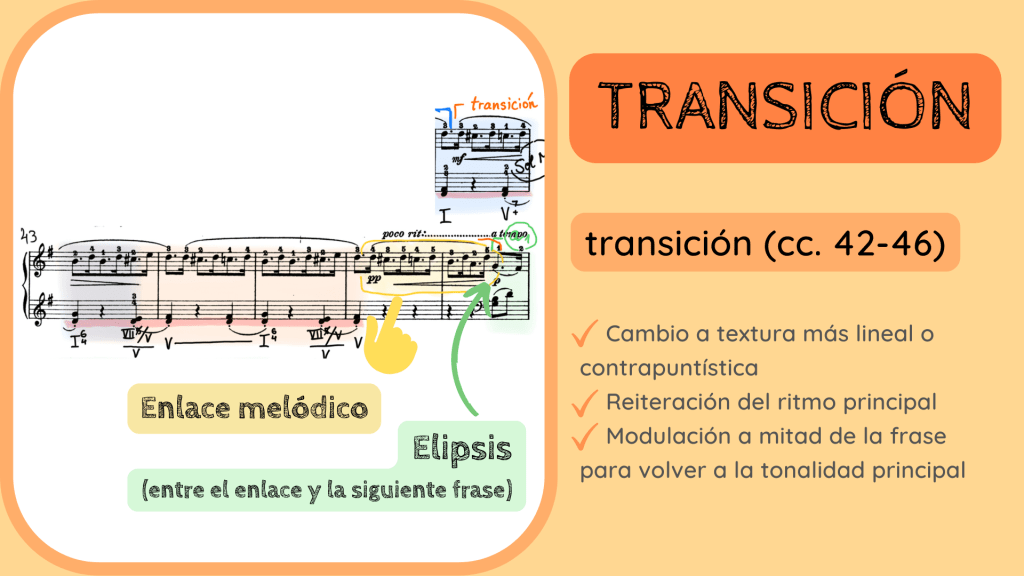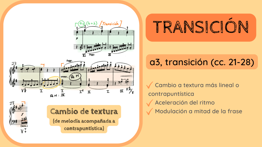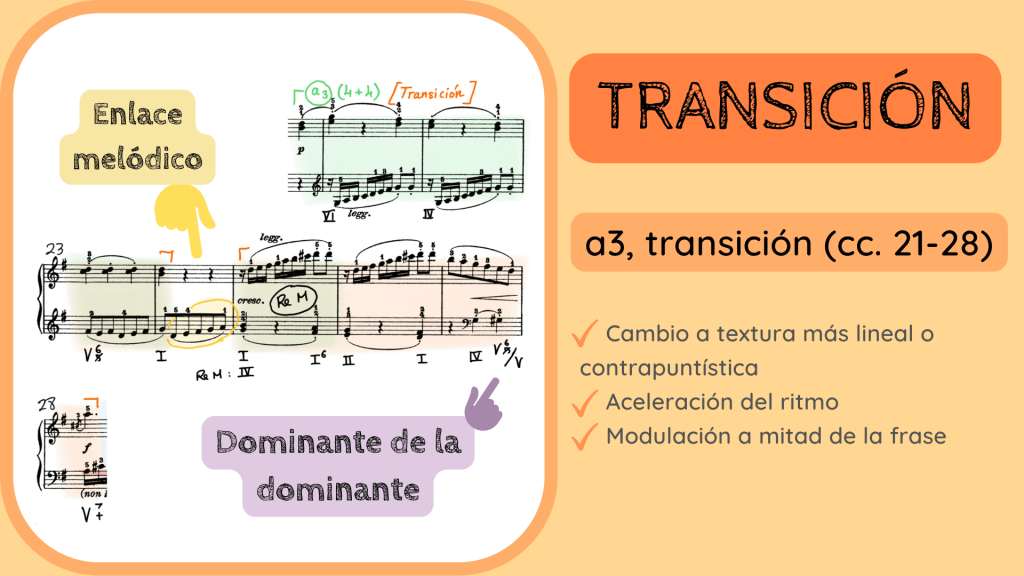 Destacan dos detalles más de esta transición. Por un lado el enlace melódico que vemos en el c. 24 y que une las dos semifrases de esta transición. Por otro lado vemos que justo al final de la transición aparece un Sol# en el bajo. Esta no es una alteración cualquiera, tiene un peso armónico y estructural. Forma una dominante de la dominante de Re Mayor, es decir, se forma el acorde Mi-Sol#-Si-Re, la Séptima de Dominante de La Mayor. Y está ahí porque da aún más fuerza e impulso a la aparición y resolución de la siguiente sección.