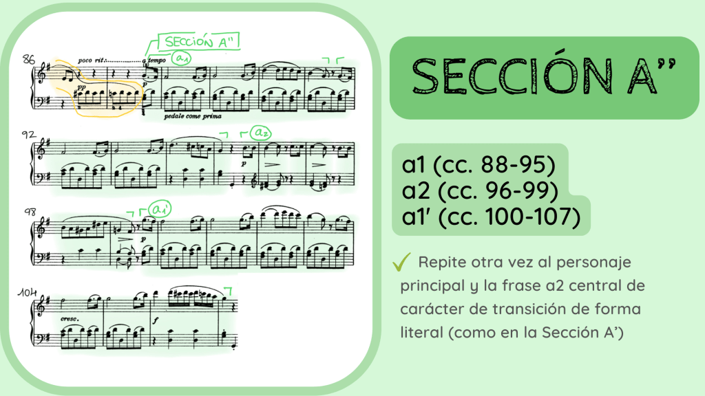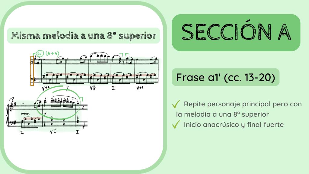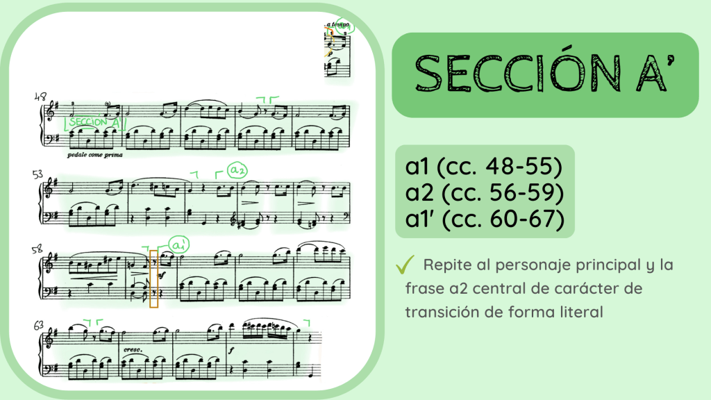 Tras la frase transitiva a2 se repite la frase protagonista. Sólo apreciamos dos variaciones ya que prácticamente es repetición literal de la Sección A’. Los cambios son, por un lado, que la melodía ahora suena una 8ª superior y que el final, el c. 19, ahora está más adornado que antes, a ritmo de semicorcheas.
