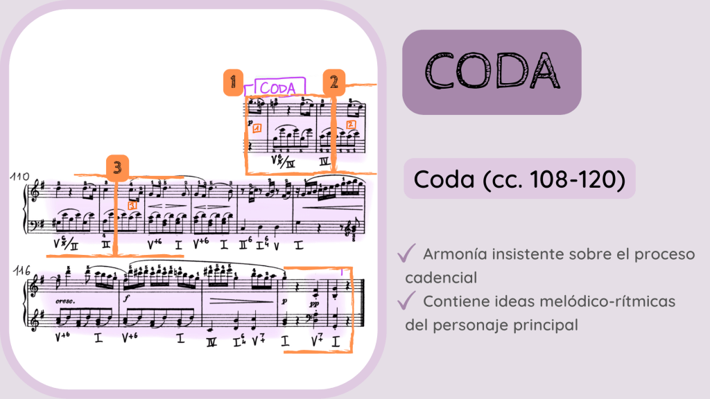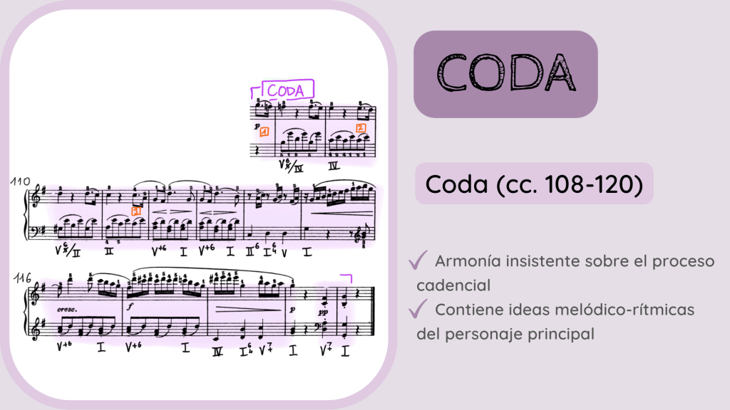 El broche final viene con esta Coda. Se inicia, como no, con la célula rítmica principal del protagonista y, además, con esa esencia de nota extraña en forma de anticipación. La armonía es ahora más interesante ya que encontramos en el c. 108 una dominante del IV, de Do Mayor que resuelve en el IV y en el c. 110 una dominante del II, de La menor que, por supuesto, resuelve en el II. Tras ello, Beethoven no hace más que reafirmar e insistir sobre el proceso cadencial, dando a esta armonía las características típicas de una coda.