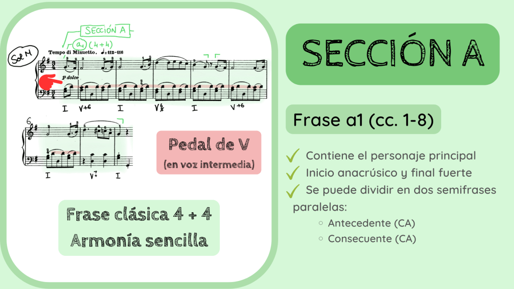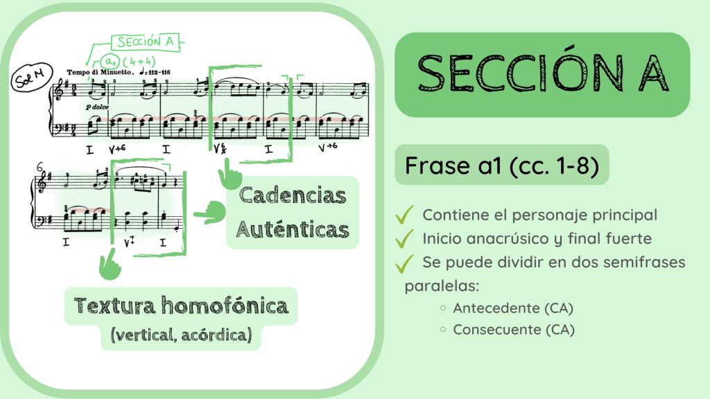 Para terminar con esta primera frase fijaos que, como suele ser habitual en los momentos cadenciales, especialmente en esta última Cadencia auténtica del c. 7, se emplea una textura homofónica. Se utiliza precisamente esa formación acórdica y vertical porque es la textura perfecta e idónea para establecer puntos cadenciales.