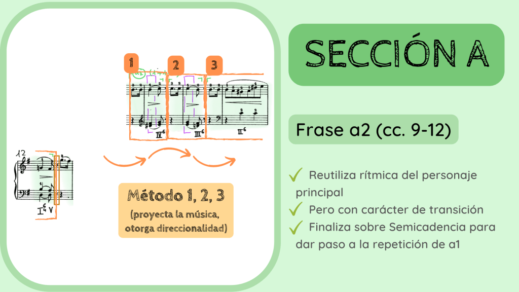 Llega ahora la frase a2. Se inicia con la fórmula melódico-rítmica del tema pero la frase tiene una función totalmente distinta a la expositiva anterior. Ahora es una frase de transición. Su final está claramente fijado en ese breve silencio estructural que encontramos en el c. 12. Pero, ¿por qué ahora esta frase tiene función transitiva? Hay varios elementos que así lo justifican.