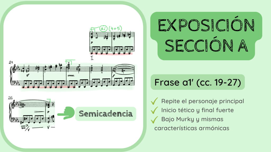 La siguiente frase repite, cómo no, al personaje principal y por eso la denominamos como a1’ (estructurándose de nuevo en una frase binaria, simétrica y contrastante). Con dicha repetición Beethoven nos está dejando claro que este es el protagonista de la obra. Sólo encontramos en él una pequeña pero importante diferencia. Si observamos el c. 26 ahora la dominante de la dominante no dura una blanca, sino todo el compás y, por lo tanto, la frase resuelve en dominante. Es decir, que se queda sin resolver en semicadencia (al contrario que antes).