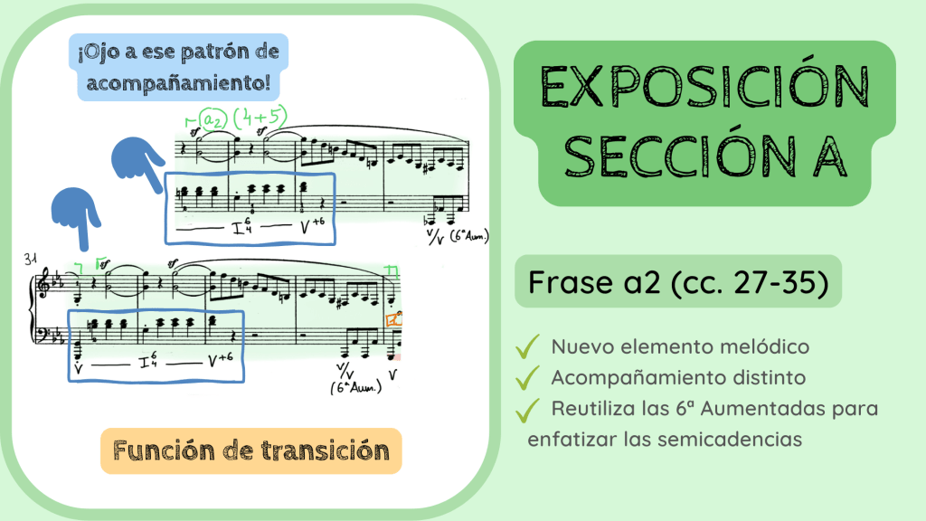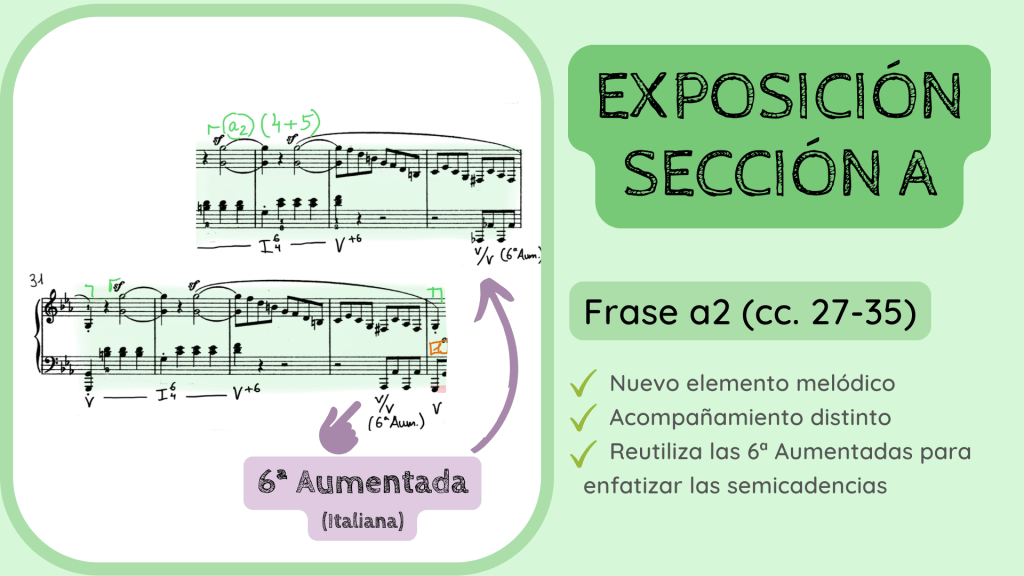 El último detalle que comentamos de esta frase son sus dos acordes de Sexta Aumentada Italiana, que insisten ambas sobre las semicadencias y el final de las semifrases sobre la dominante. Otro elemento más que aumenta la tensión de esta frase a2 y que nos provoca la sensación de que esto nos lleva hacia algún sitio.