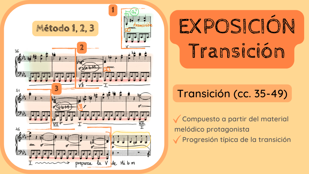 Sobre la nota pedal de Tónica escuchamos durante los primeros cuatro compases el tema principal, transformado ahora en modo mayor sobre la tonalidad de Mib Mayor. Tras escuchar al protagonista la línea del bajo comienza un descenso: Mib-Re-Do-Sib-Lab-Sol hasta llegar al Fa#, su objetivo. ¿Por qué? Porque Beethoven busca esa nota que le va a hacer doble función. Por un lado le sirve para que cuando se alcance la casilla de 1ª repetición el Fa# se convierta en una dominante de la dominante que nos lleva a la semicadencia sobre Do menor para así, repetir toda la exposición. Por otro lado, en la casilla de 2ª repetición el Fa# se queda ahí, sin cambiar a otro acorde, como dominante de Sol menor. De esta manera su resolución nos lleva hacia otro centro tonal, hacia la siguiente sección…