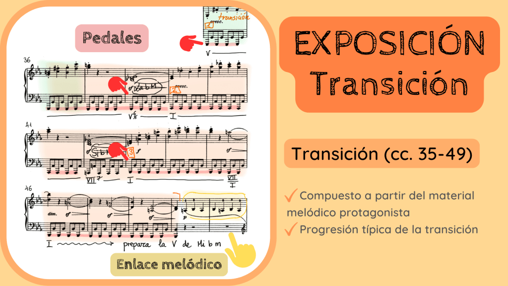 Como último detalle de la transición mencionar cómo se ha ido construyendo toda la armonía sobre unas notas pedales que se han ido moviendo desde el Sol, luego al Lab y luego al Sib, realizando esa línea en el bajo que iba directa hacia la nota Sib. Todos los elementos de la transición nos conducían, por tanto, hacia el c. 43 donde se establece dicha nota como la más importante.