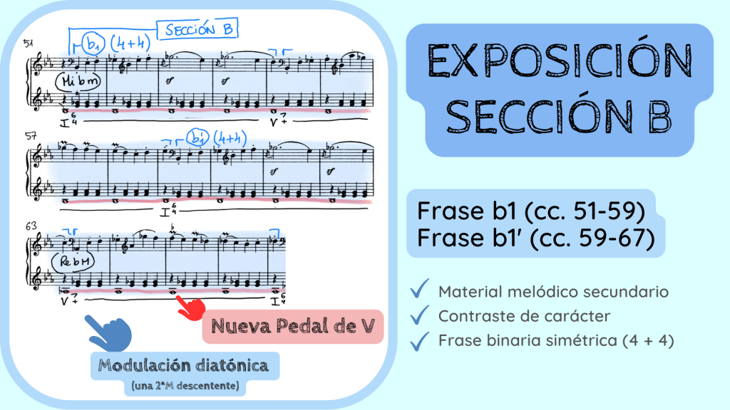 La repetición de la frase b1’ implica, como hemos dicho antes, que se convierte en el personaje secundario del movimiento. A partir del c. 63 la semifrase consecuente de la frase b1’ modula hacia Reb Mayor. Desciende una 2ªM con respecto a Mib menor. Esta modulación que rompe la sensación de haber asentado la tonalidad de la Sección B de la Forma-Sonata no era habitual para los clásicos. Son los románticos los que empiezan a desplazar los centros tonales incluso dentro de las Secciones principales y estables. No obstante, en breves, la Sección B regresará a su centro tonal de Mib. Aun así, la repetición de un mismo material melódico-rítmico nos da esa coherencia dentro de la Sección B. Dicha modulación trae consigo una nueva nota pedal que continúa en su función de Dominante con la nota Lab.