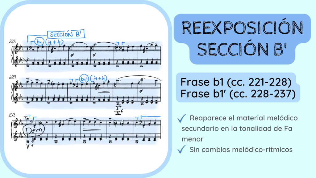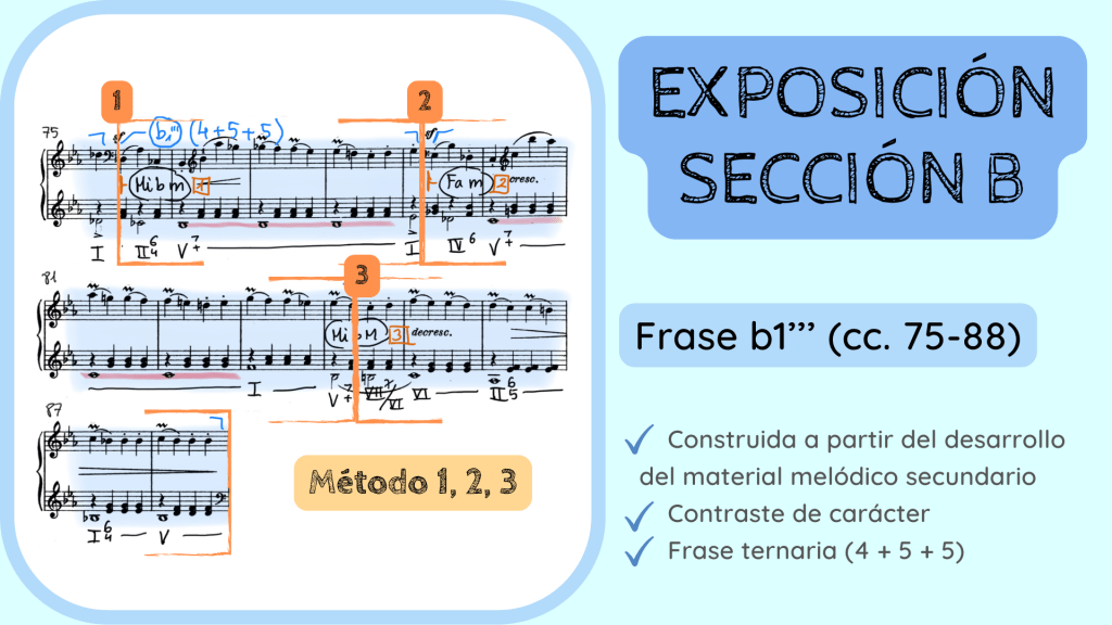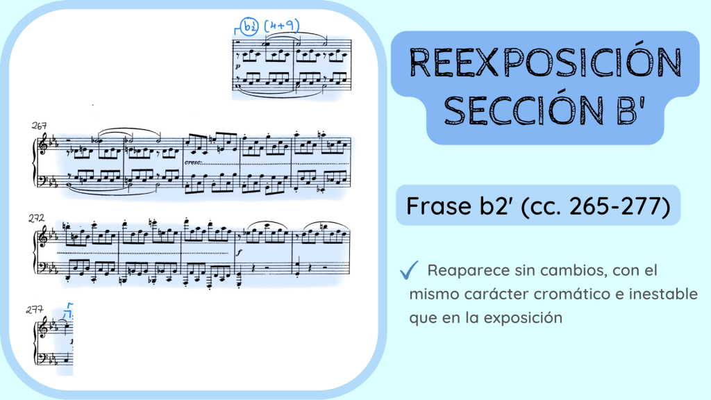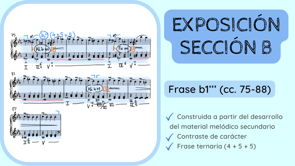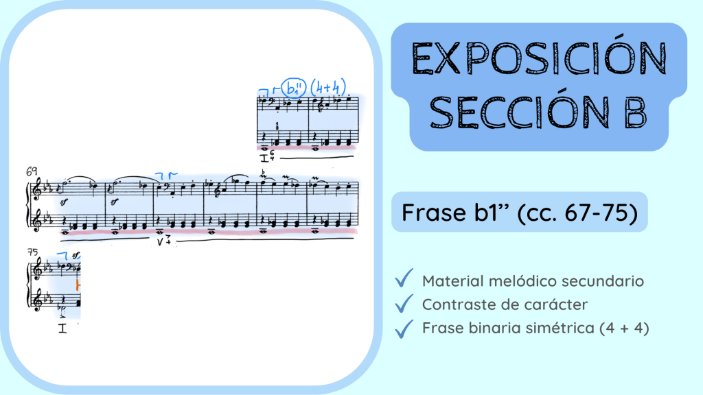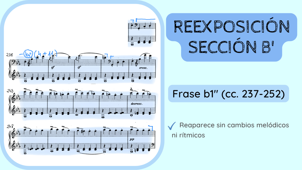 La siguiente frase b1’’ aparece sin cambios con respecto a la exposición en su inicio. Sí que destaca un pequeño cambio armónico con respecto a su final que es muy fácil de reconocer auditivamente, me refiero a un proceso armónico que ocurre en la ampliación de la segunda semifrase que veis en la diapositiva.