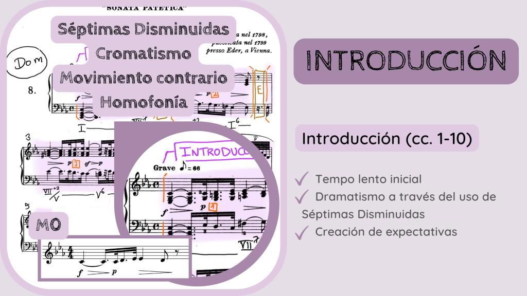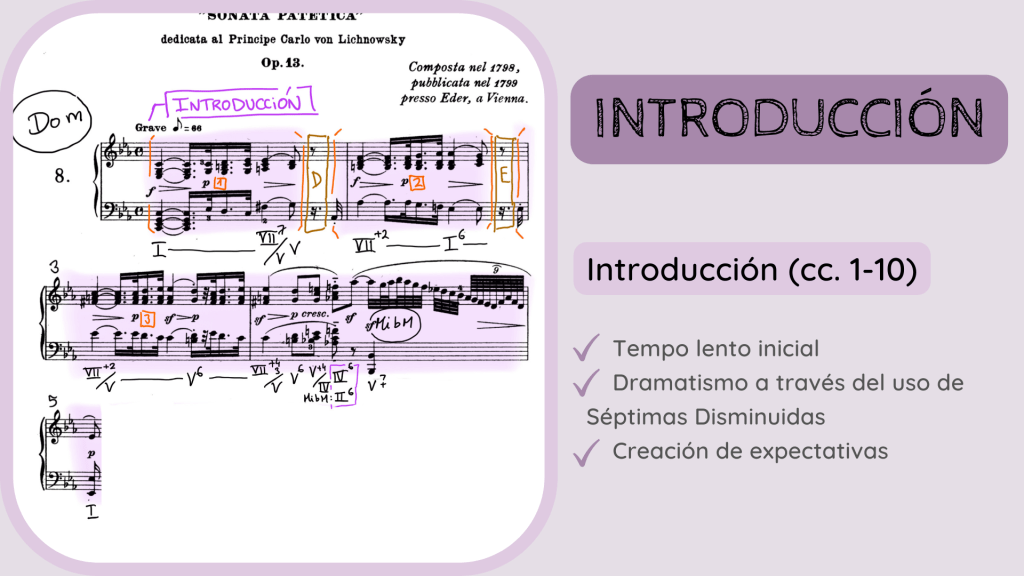 Al tratarse de un primer movimiento, como ya sabéis por otros vídeos, la Forma Sonata será casi con toda seguridad la estructura sobre la que se cimentará el discurso musical. La forma sonata en esta obra aún se rige por una claridad clásica aunque Beethoven ya comienza a mostrar su lado más impetuoso y unos nuevos rasgos románticos. Y aquí va el primer rasgo novedoso del Romanticismo que está por llegar en la música occidental, vemos como este primer movimiento se inicia con un tempo que nada tiene que ver con el habitual allegro más rápido de la forma sonata. Me refiero al tempo grave indicado por Beethoven que nos embauca con esta maravillosa introducción. En ella encontraremos algunas de las características armónicas, melódicas y rítmicas que serán esenciales en el resto del movimiento. Es decir, que esta introducción no sólo está para crear una expectativa en el oyente, sino que da sentido y coherencia a todo lo que está por venir.