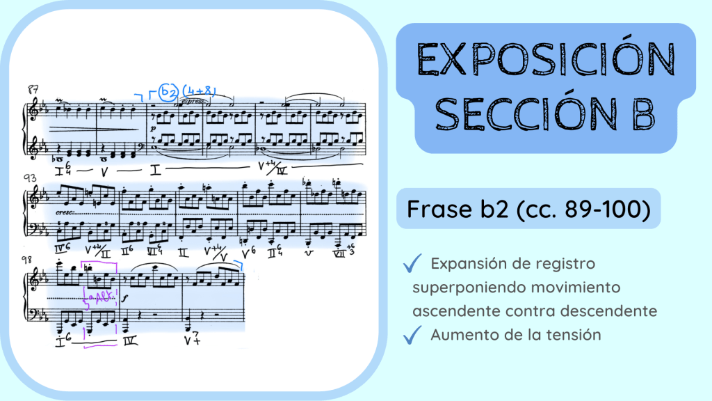 Llegamos ahora a una nueva frase b2, distinta a lo anterior en su melodía y en su acompañamiento. Basta con escucharla para comprobar que contiene en su interior una gran energía, proyección y direccionalidad. Es por ello que su carácter nos ayuda a determinar que es una frase más de transición que expositiva, que está ahí para conducirnos hacia algún punto.