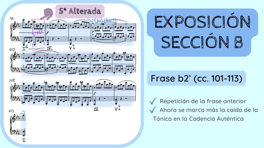 La burbuja aún no ha explotado, sino que se va a hacer más grande. Beethoven decide repetir la frase b2’ y, por lo tanto, la tensión se va a seguir acumulando sin que el final de la b2 se haya resuelto, habrá que esperar al final de b2’. Y por cierto, destacar entre los cromatismos que se producen el acorde alterado del c. 98 que se conoce como 5ª Alterada y que aparece en una de sus formas más habituales, alterado la quinta ascendentemente en un acorde de tónica. Se trata de un mero adorno que altera la sonoridad del acorde pero no la función del mismo. Este acorde será muy utilizado y explotado durante el Romanticismo.