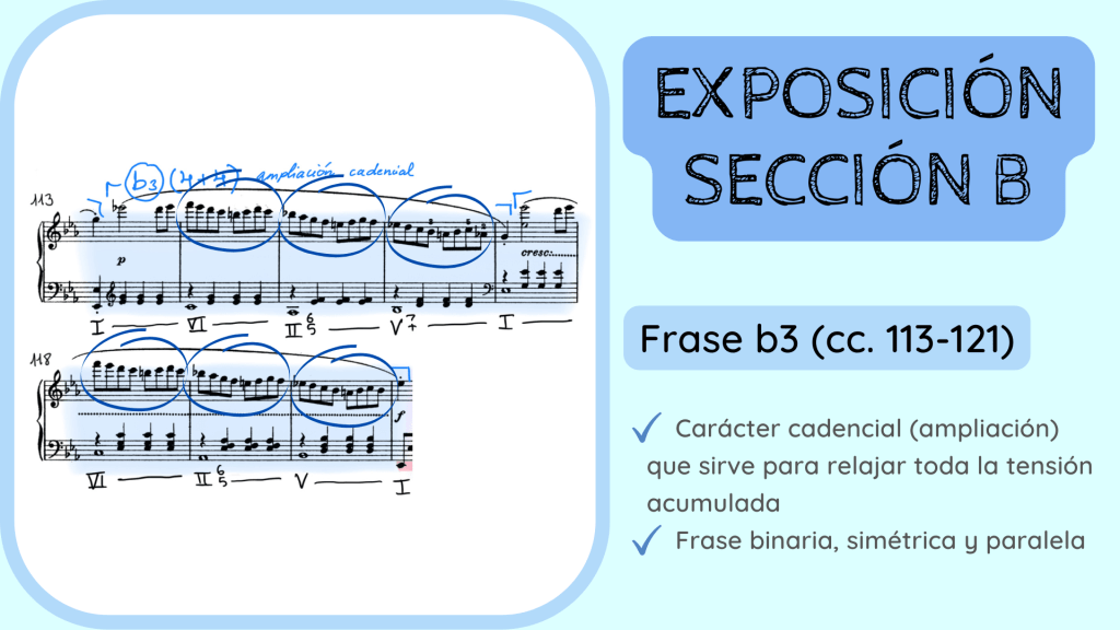 Y por fin, toda la tensión acumulada resuelve en esta última frase b3 que recupera el patrón de acompañamiento ya usado anteriormente y una línea melódica simple que, como veis en pantalla, se secuencia en la propia melodía. La armonía sencilla con las funciones de subdominante, dominante y tónica de esta frase binaria, paralela y simétrica es justo lo que necesitaba la música para relajar toda la tensión acumulada. Esta frase pretende ser expositiva, ya que repite el mismo tema dos veces y nos lleva hasta la Cadencia Auténtica Perfecta del c. 121.