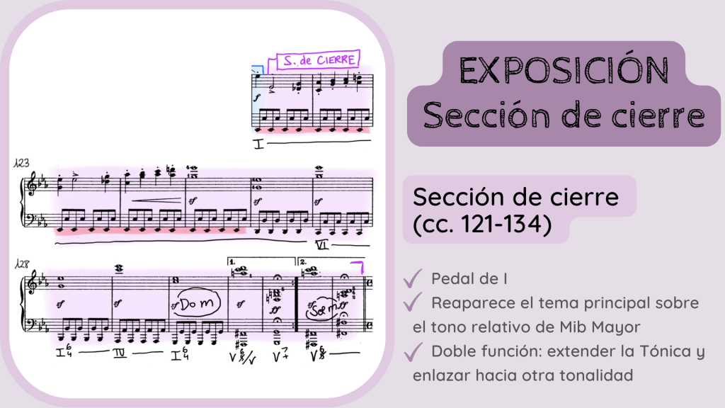 Justo después aparece una gran pedal de Tónica que es una de las más importantes características de una coda. Recordad que como estamos en una forma sonata, el término de coda lo reservamos para el final del movimiento ya que, literalmente, coda es cola en italiano, es el final de una obra. Por ello denominamos a esto como Sección de cierre, que pone punto y final a toda la exposición.