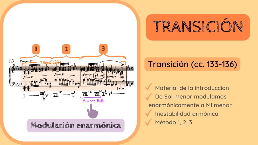 Y, efectivamente, la frase anterior anticipaba ese carácter de transición. Ahora sí que nos encontramos, en este pasaje, con la característica estrella de una transición que se puede ver a simple vista sobre la partitura…