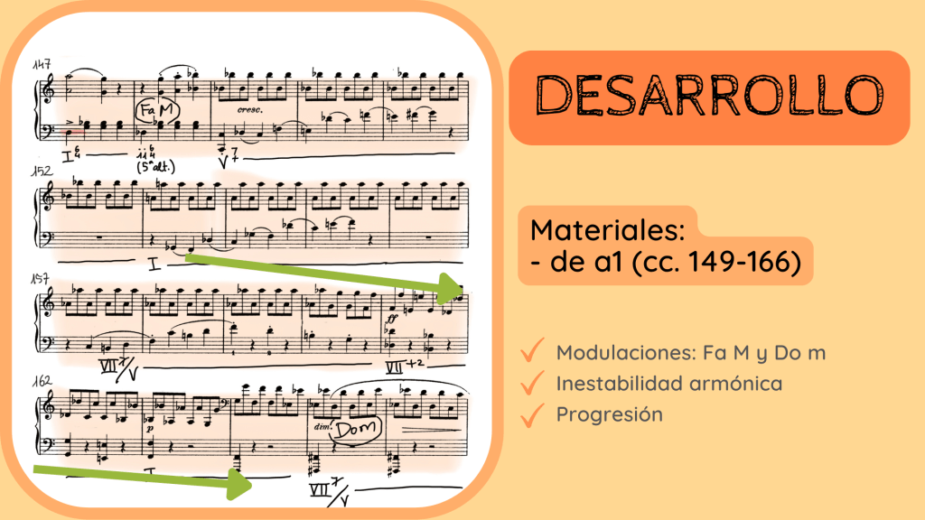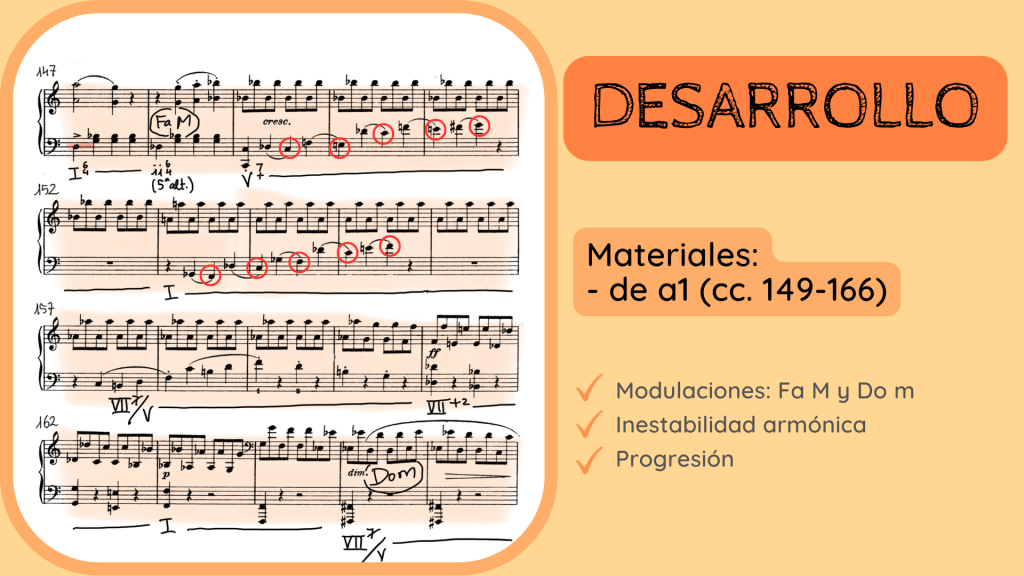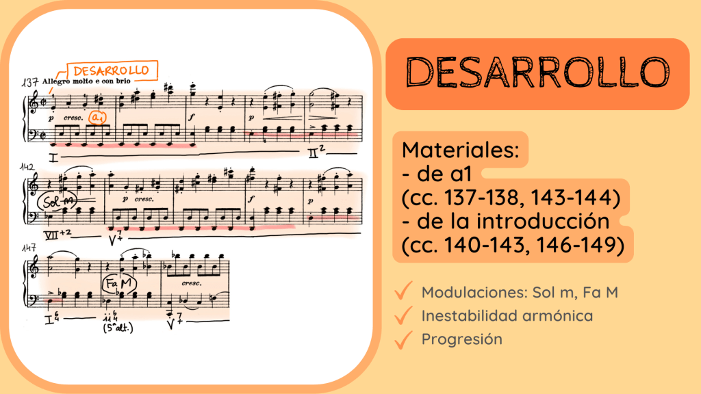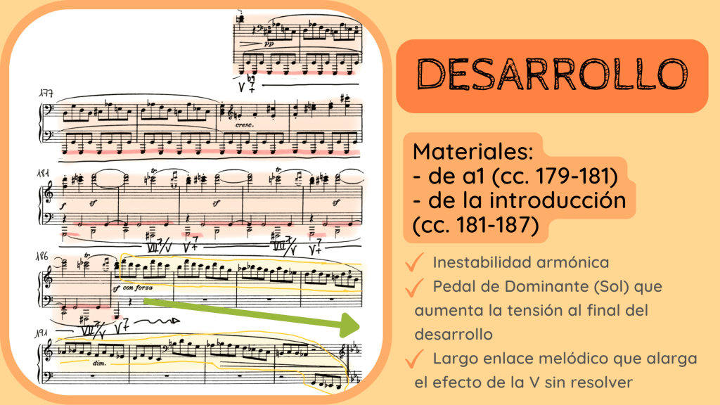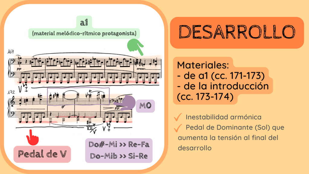 Pues al punto de más tensión que normalmente tiene el desarrollo de una forma sonata. Nos lleva a la larga pedal de V que desencadenará, en una gran explosión, en el regreso al material protagonista en la tonalidad principal de Do menor. Este pasaje tiene una gran carga de disonancias ya que las encontramos en abundancia sobre la pedal de dominante. Por un lado están los cromatismos que se producen entre los cc. 167 al 170. Y por otro lado está la combinación melódica entre el material protagonista, que ya de por sí tenía un carácter muy cromático, y el M0 que surge después. Tenemos constantemente un juego de notas que aparecen como disonancias para después resolver. Me refiero al Do# y Mi que acaban resolviendo siempre a las notas Re-Fa y también las notas Do y Mib que se desplazan descendentemente a Si-Re. Es decir, un largo y constante proceso de adornar el acorde de dominante y, por lo tanto, cada una de sus notas: Sol-Si-Re-Fa.