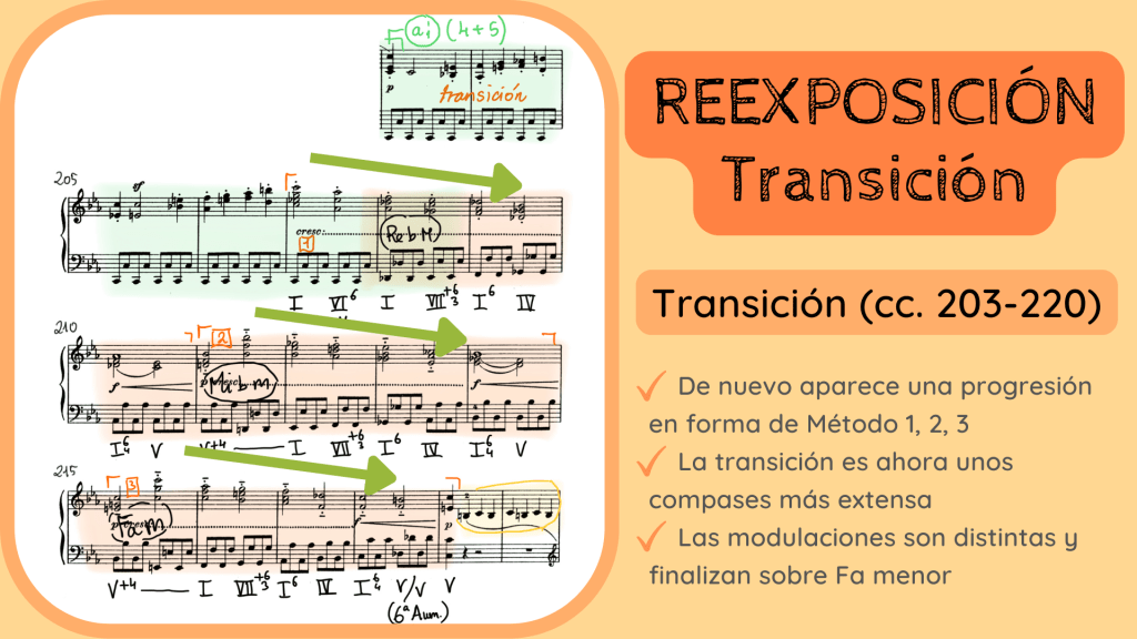 Al contrario que en la exposición, ahora la reexposición tiene una Sección A’ muy breve. Esta segunda frase que vemos, antes de terminar, ya ha empezado a modular y a realizar la misma progresión a la que ya estamos acostumbrados, en forma de Método 1, 2, 3. La línea melódica que se repite de forma descendente en la progresión va pasando sobre distintas tonalidades. Primero está en Reb Mayor ya que Beethoven aprovecha el VI de Do menor (Lab-Do-Mib) para usarlo como acorde puente, siendo una dominante de Reb Mayor. La siguiente repetición es Mib menor, es decir, que todo se ha transportado una 2ª Mayor. La tercera aparición vuelve a subir un tono y se va a Fa menor, incluso se enfatiza la nota dominante de esta tonalidad, la nota Do justo al final, cuando aparece de forma sorpresiva la 6ª Aumentada del c. 218. Ésta enfatiza con su resolución la nota dominante Do que justo en el último compás que veis en pantalla hace el mismo enlace melódico que ya habíamos visto anteriormente. Viendo la progresión resulta evidente que es ahí donde Beethoven nos quería conducir a Fa menor con esas modulaciones de tono en tono.