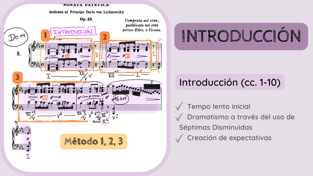 También aquí la frase se construye en esa progresión característica del Método 1, 2, 3. Y vemos que la armonía, en la primera repetición, el c. 6, regresa a la tonalidad de Do menor y ahí permanecerá hasta el final. La armonía sigue reflejando a través del uso de acordes de la familia de las dominantes, especialmente los disminuidos, ese dramatismo que caracteriza ya a esta introducción.