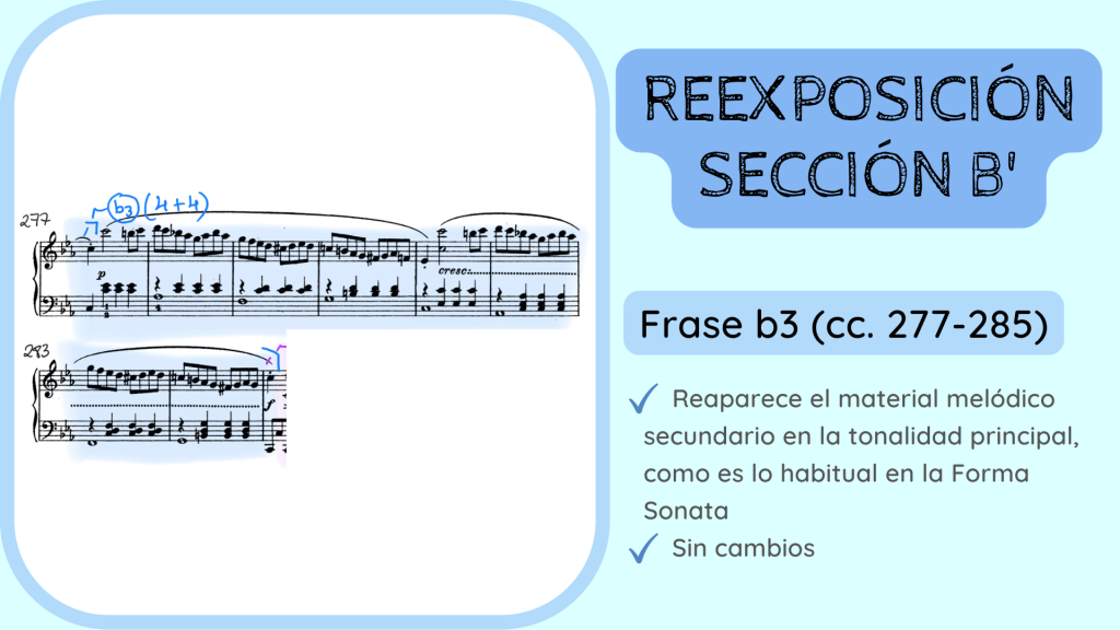 La frase b3, otra vez, aparece repetida sin cambios pero con una particularidad. La habíamos escuchado en la exposición en Mib Mayor. Por lo tanto, ahora en Do menor, presenta un carácter un distinto.