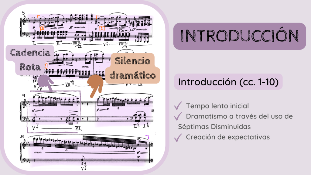 Del primer motivo de la introducción podemos analizar sus características y éstas serán determinantes en el resto del movimiento. Vamos a mencionarlas: primero y más evidente, la línea melódica que asciende y desciende y que la vamos a denominar como Motivo 0, ya que no será el principal protagonista pero sí destacará su presencia a lo largo del movimiento. Ese movimiento ascendente y descendente en un perfil que parece una montaña lo vamos a encontrar reflejado más adelante en otros fragmentos. Segundo, destaca el dramatismo y la profundidad con la que se impregna la música y el carácter de la misma a través del uso de la disonancia del acorde de Séptima Disminuida y del uso del cromatismo. Tercero, el acorde de Séptima Disminuida con su sonoridad de apoyatura que resuelve por semitono en el acorde de la Dominante, generando así el silencio dramático de después. Cuarto, el movimiento contrario entre las voces superior e inferior que, de alguna manera, ya lo he mencionado con el perfil melódico del M0, pero aquí ocurre de forma simultánea en las voces extremas. Y por supuesto, esto lo volveremos a ver. Quinto y último, la verticalidad del fragmento que tiende a una textura homofónica.
