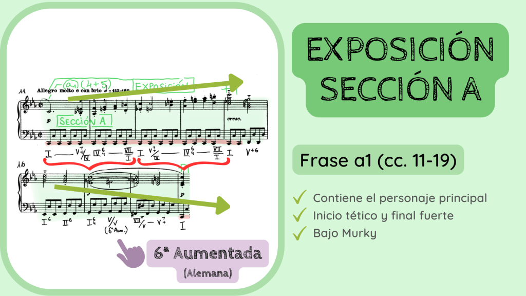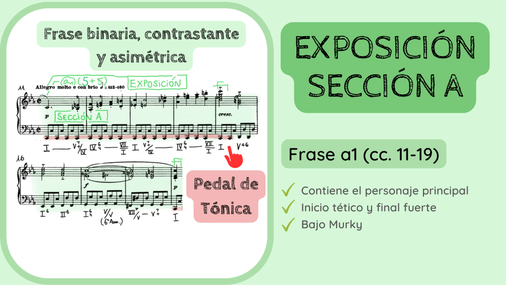 Y ahora sí, aparece el material melódico-rítmico protagonista que da inicio la primera gran parte de la forma sonata que denominamos como Exposición y, a la vez, se inicia la primera Sección A. Esta frase a1 es de estructura binaria aunque como se produce una elipsis en el tiempo fuerte del c. 15. Es por ello que, al contar la cantidad de compases de ambas semifrases, se produce un 5 + 5 y, por lo tanto, tendríamos unas semifrases simétricas. Sin embargo, otra forma de ver el fraseo es considerar que la estructura es 2 + 2 + 4 (si no contamos los tiempos fuertes). La repetición del principio se ve en la melodía, que se repite una 8ª aguda y en la armonía que se repite de forma exacta con un patrón de acompañamiento que, como el bajo Alberti es muy usado y recibe su propio nombre, el Bajo Murky, que viene a ser como un tremolo a octavas. Todo ello sobre una pedal de Tónica que ancla y mantiene la frase en la estabilidad de la tónica. Por último añadir que las semifrases de a1 son contrastantes.