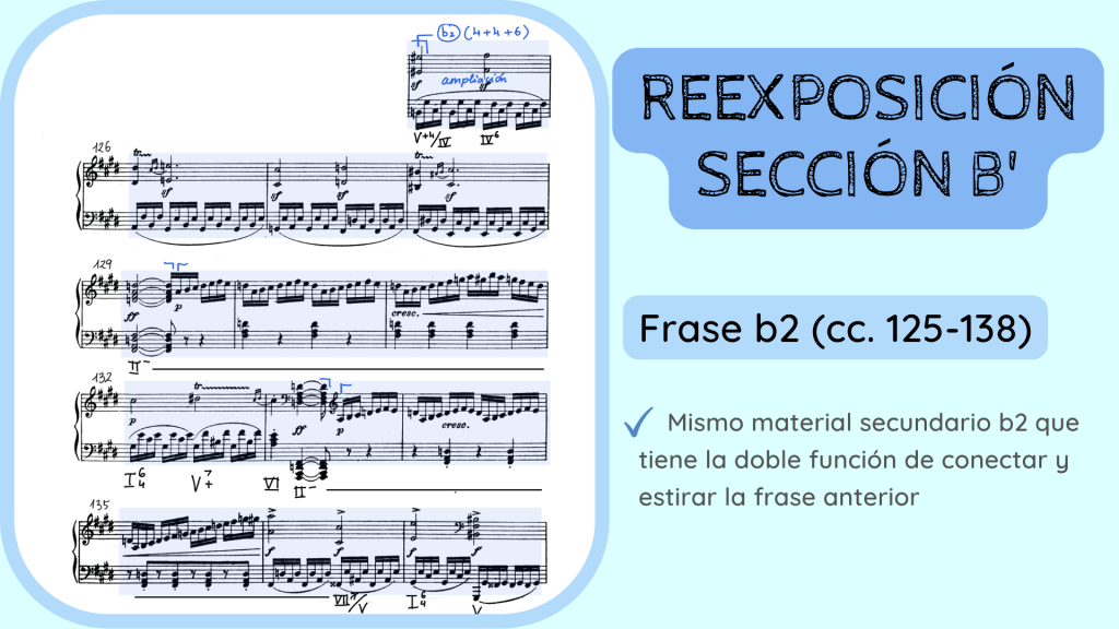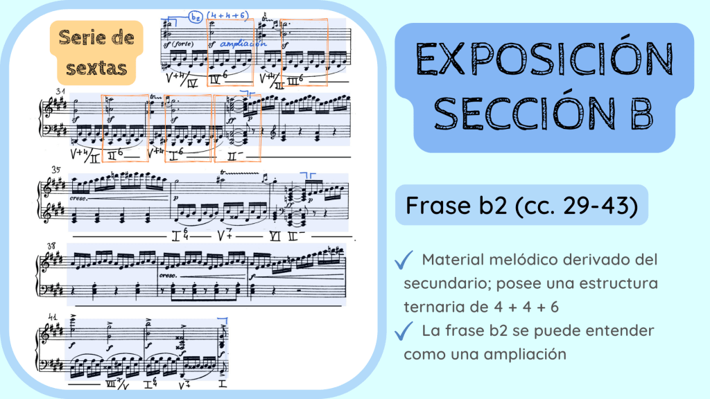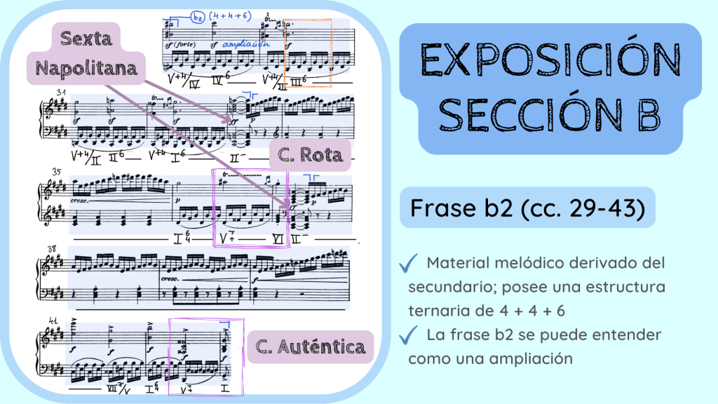 Y antes de pasar a la siguiente diapositiva de la frase b3 vuelvo a lo que comentábamos antes de la función de esta frase. Ahora que ya hemos visto toda su armonía sorpresiva con las Sextas Napolitanas extendidas y la Cadencia Rota que no hace más que posponer la inevitable Cadencia Auténtica, es por estos motivos por los que esta frase b2 está a mitad camino entre ser un elemento melódico nuevo e importante y ser una ampliación de la frase b1.