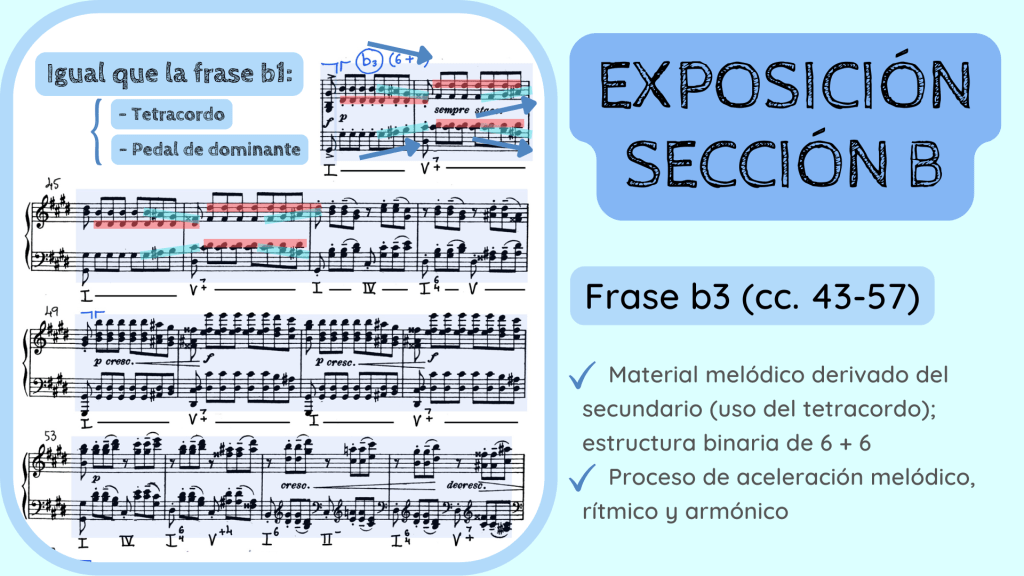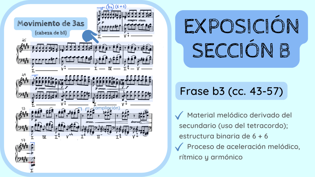 Y ahora sí, llega esta nueva frase que, a diferencia de la anterior, no hay duda; es un nuevo elemento melódico. La frase b3 tiene una estructura binaria, simétrica (ya que son 6 + 6 compases) y paralela (porque repite el mismo material melódico en ambas semifrases).