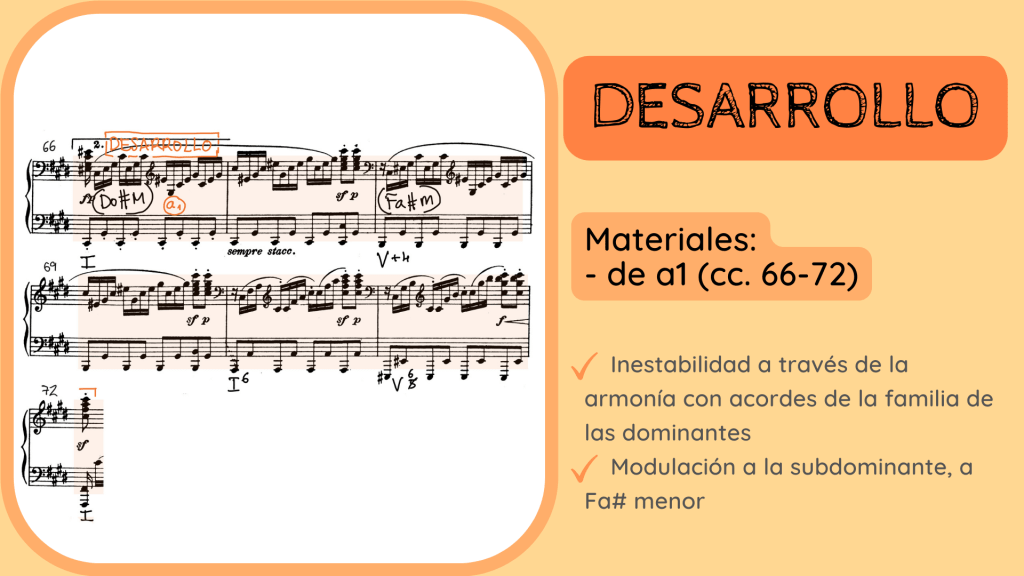 Comienza la siguiente gran sección: el Desarrollo. Esta parte, como ya sabéis, escapa a cualquier esquema formal puesto que aquí cada compositor hace gala de sus habilidades creativas. Pero vamos a ver cómo le da forma Beethoven. Hay que tener en cuenta que el desarrollo proviene del final de la Sección de Cierre en la que una dominante de Do# menor aparecía con las notas Sol#-Si#-Re#-Fa#. Recordad que esta dominante es igual para las tonalidades homónimas de Do# menor y Do# Mayor. Es por ello que al resolver dicha dominante en el c. 66 ésta soprende al oído y la he marcado con la tonalidad de Do# Mayor. Aunque en realidad, dicho acorde de tónica es una excusa para, en el c. 68, modular a Fa# menor, la subdominante de la tonalidad principal. Es decir, que el acorde de Do# Mayor de los cc. 66 y 67 podría considerarse un acorde puente ya que es tónica de Do# Mayor y a la vez está haciendo ya de Dominante de Fa# menor aunque realmente he marcado la modulación en el lugar correcto, donde aparece en el bajo la nota Si, que forma la 7ª menor con el acorde de Do# Mayor y es ahí donde se confirma que el acorde se convierte en dominante. A nivel melódico-rítmico es evidente que esta frase se elabora a partir del material protagonista a1. De hecho se puede apreciar la misma estructura de 2 + 2 + 4 y el mismo proceso de aceleración que escuchábamos al comienzo del movimiento.