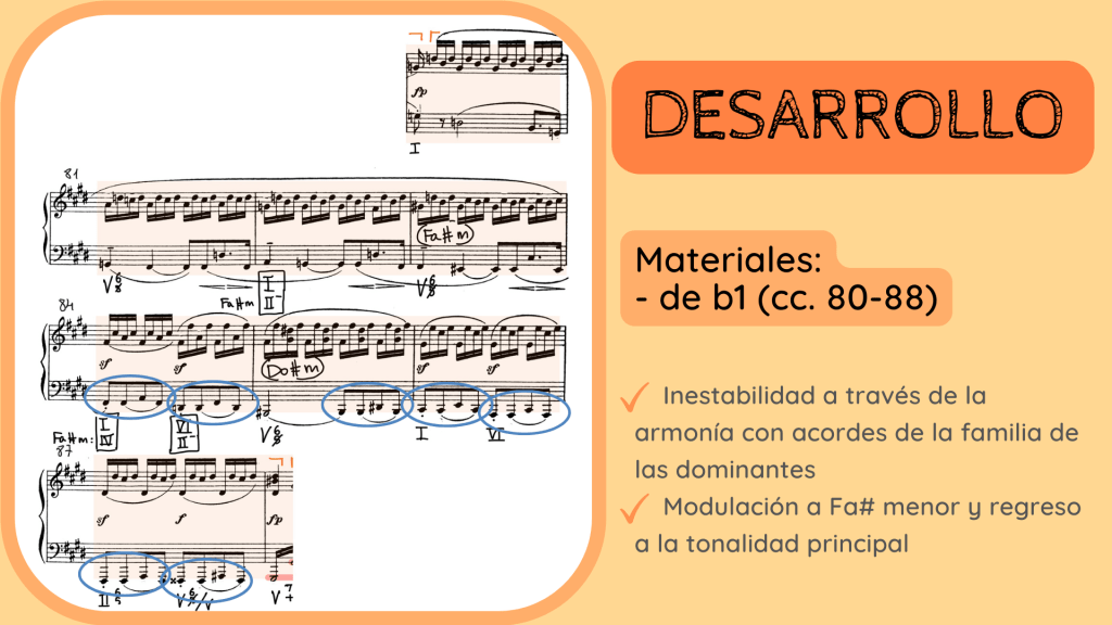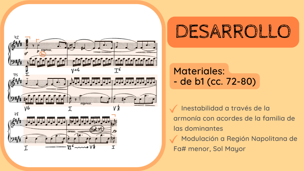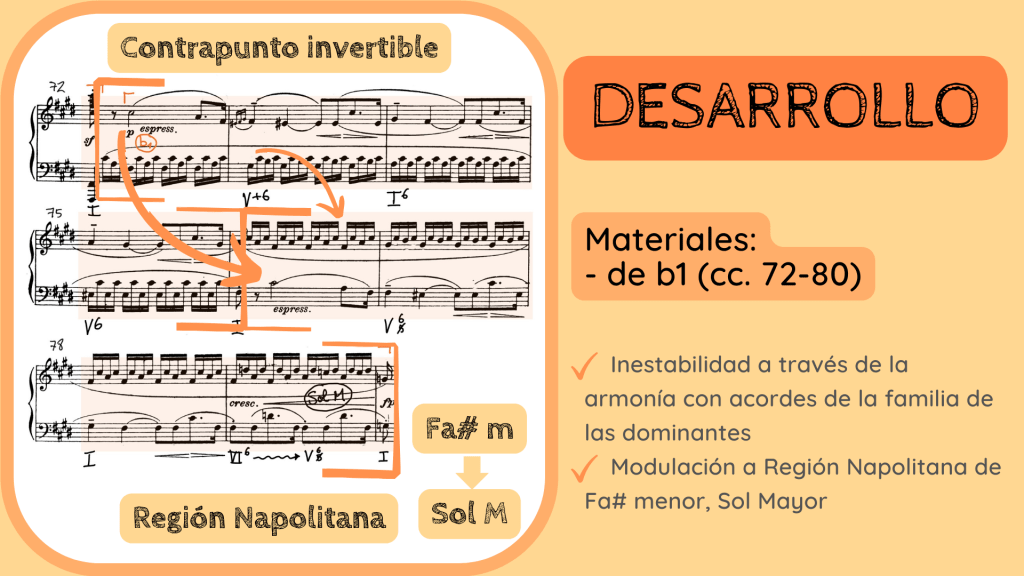El tema b1 se sigue desarrollando ahora hasta el c. 83 en la mano izquierda del pianista con sus mismas características ya comentadas. En el c. 83 se regresa a la tonalidad de Fa# menor y termina así este pasaje que ha tenido lugar en la Región Napolitana de ésta. En el c. 84 el mismo acorde que nos había llevado a Sol Mayor como su dominante, el VI de Fa# menor conformado por las notas Re-Fa#-La, ahora le sirve a Beethoven otra vez para establecer una relación de sexta Napolitana. Ahora el VI de Fa# menor es la Región Napolitana de Do# menor. Y así, por acorde puente, modula en los cc. 84-85 para regresar a la tonalidad principal. Es decir, que está preparando el discurso para la reexposición y por lo tanto aumentará considerablemente la tensión en este punto del final del desarrollo. Resumiendo, que es muy interesante cómo Beethoven utiliza un mismo acorde, el VI de Fa# menor que es Re-Fa#-La para ir a distintos lugares tonales, primero como dominante de Sol Mayor (la Región Napolitana de Fa# menor) y después como Sexta Napolitana de la tonalidad principal, de Do# menor.