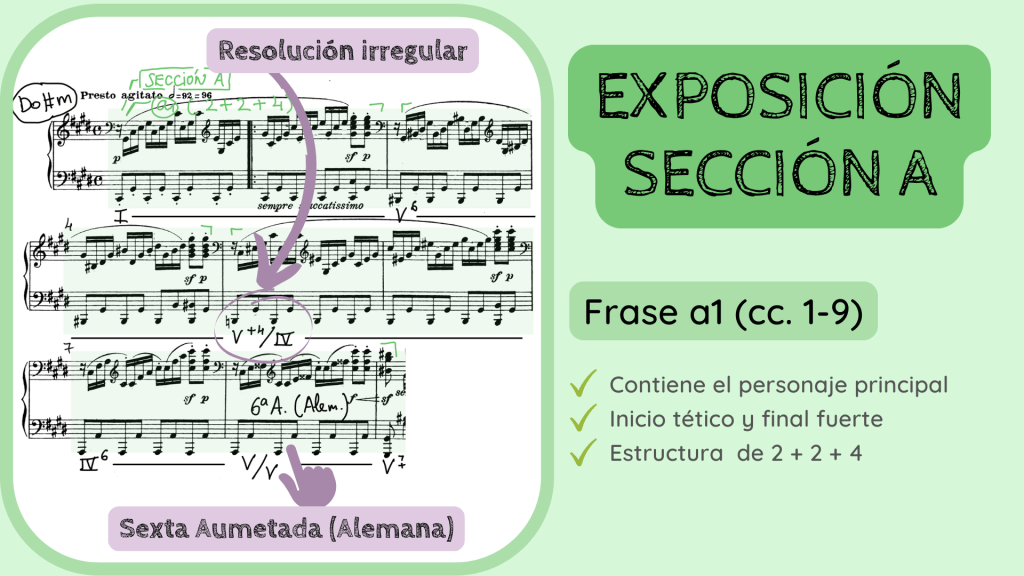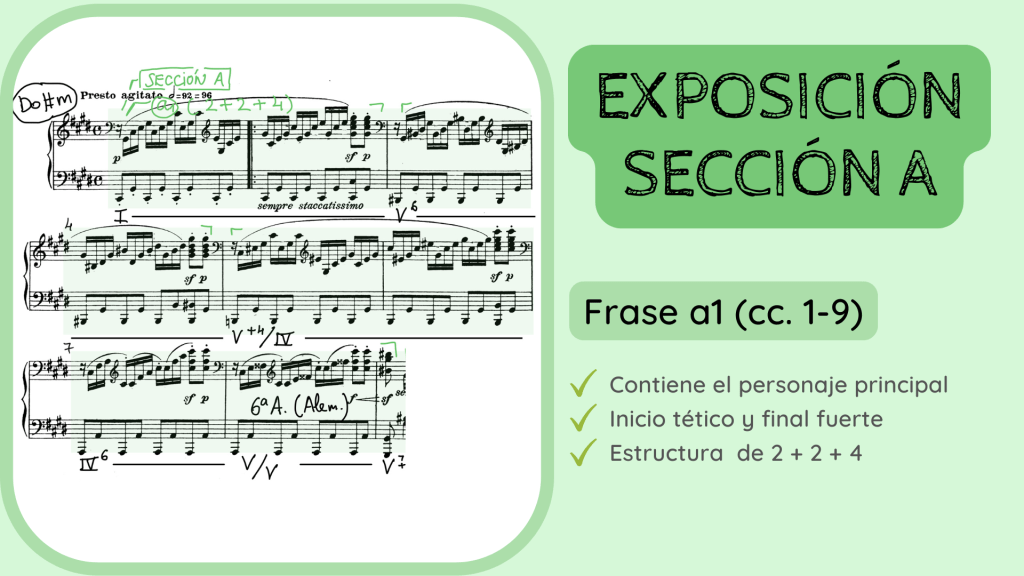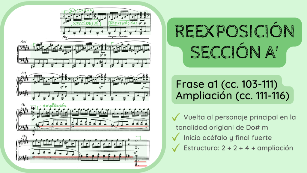 Tras la tajante Cadencia Auténtica da inicio una larga pedal de tónica que, junto a la alternancia de los acordes de dominante y tónica, tenemos la mezcla perfecta entre las dos características más habituales de una coda. Esta parte que tiene función conclusiva para cerrar la exposición, al no tratarse del final de la obra, la denominamos como Sección de Cierre. Cabe resaltar varios detalles de esta diapositiva: primero, la aparición, al final, del M1 del tema a1 que da comienzo a la repetición de toda la exposición. Segundo, el uso de la pedal de tónica que, a partir del c. 64 prepara la vuelta a Do# menor y, por lo tanto, pasa a convertirse de nota pedal de tónica a pedal de dominante. Y tercero, sobre la pedal de tónica se forman acordes de dominante que, como ya hemos visto en otros vídeos, denominamos como dominantes sobretónicas.