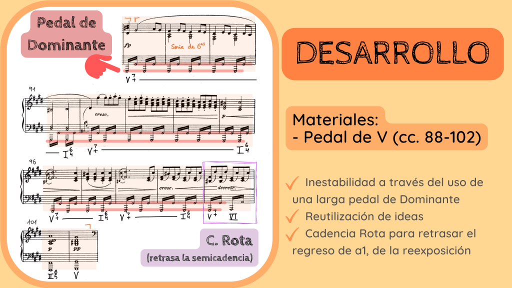 Y llegamos así al habitual último fragmento del desarrollo que contiene una larga pedal de dominante. Aquí se recupera la idea de utilizar la serie de sextas que como veis aparece primeramente a blancas en los cc. 88-91 y luego se acelera a corcheas en los cc. 93-94 dando así una sensación de aceleramiento. A partir de ahí la armonía se alterna entre un I en sexta y cuarta cadencial con dominante para llevarnos, otra vez de forma sorpresiva, a la cadencia Rota del c. 100 que está para provocar la misma sensación que había ocurrido antes, la de sorprender y así retrasar lo inevitable, que en este caso es la aparición de la semicadencia del c. 102 que dará paso al tema a1 y la reexposición.