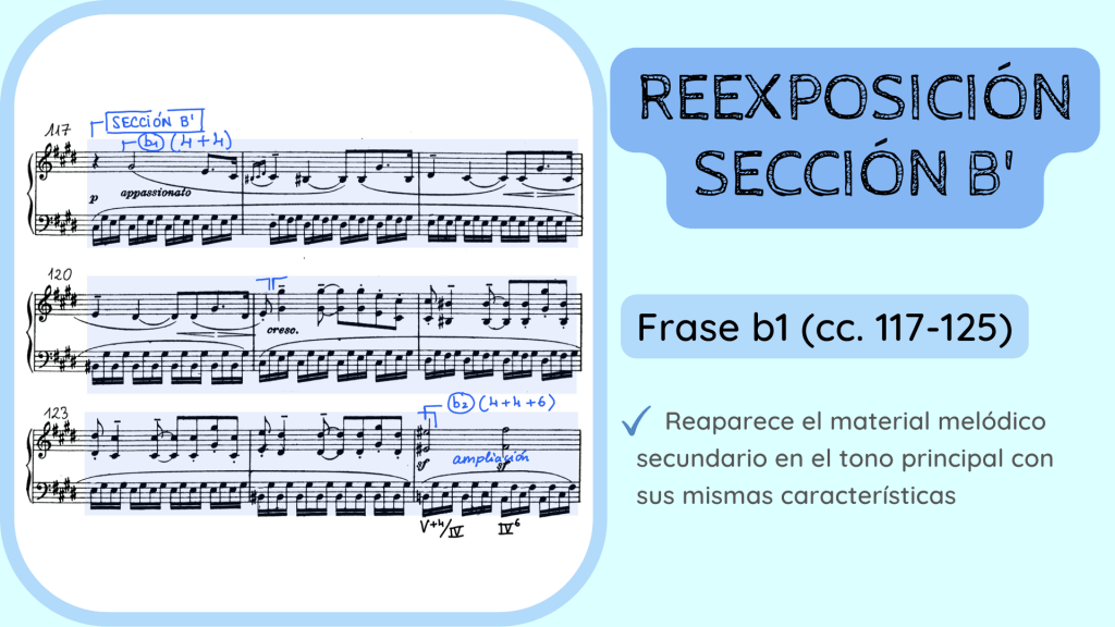 Porque recordad que ahora en la reexposición ambas secciones A’ y B’ aparecen en la tonalidad principal. Es por ello que la anterior semicadencia le venía genial a Beethoven para no tener porqué escribir una transición. La frase b1 aparece sin cambios con sus mismas características de uso de apoyaturas y Bajo Alberti en el acompañamiento. Vuelve a surgir esa Cadencia Evitada que une la frase b1 con la b2.
