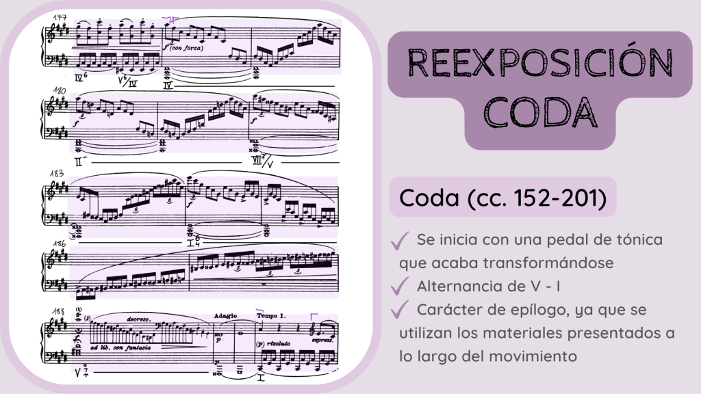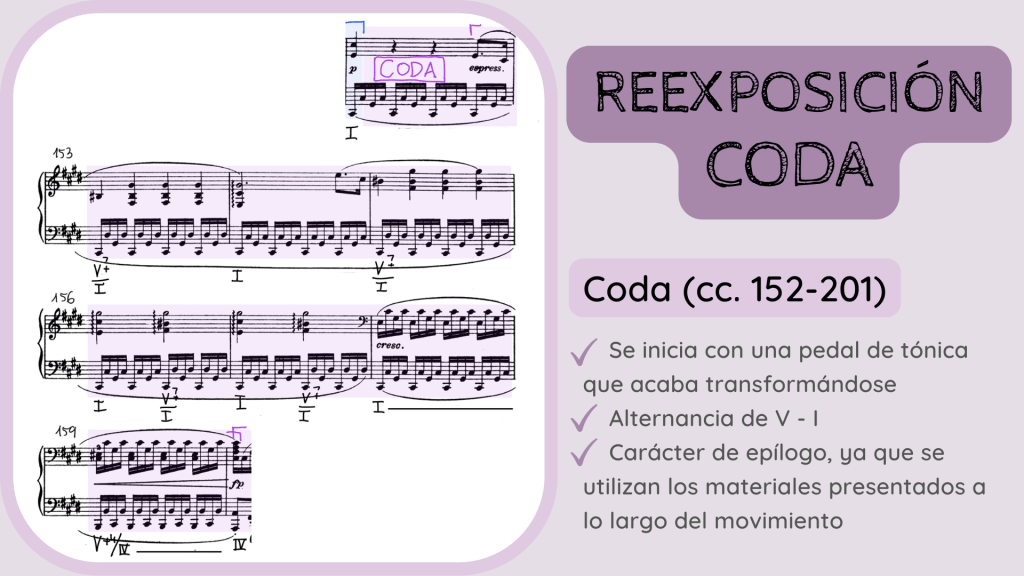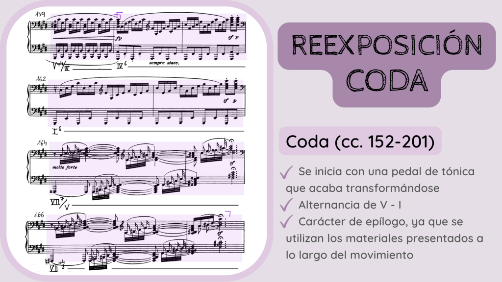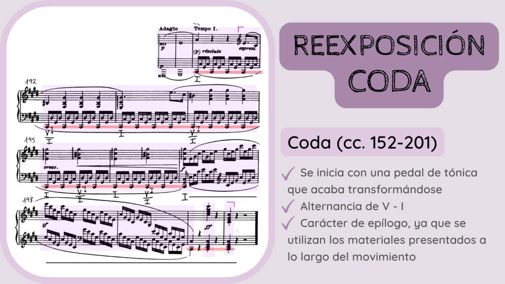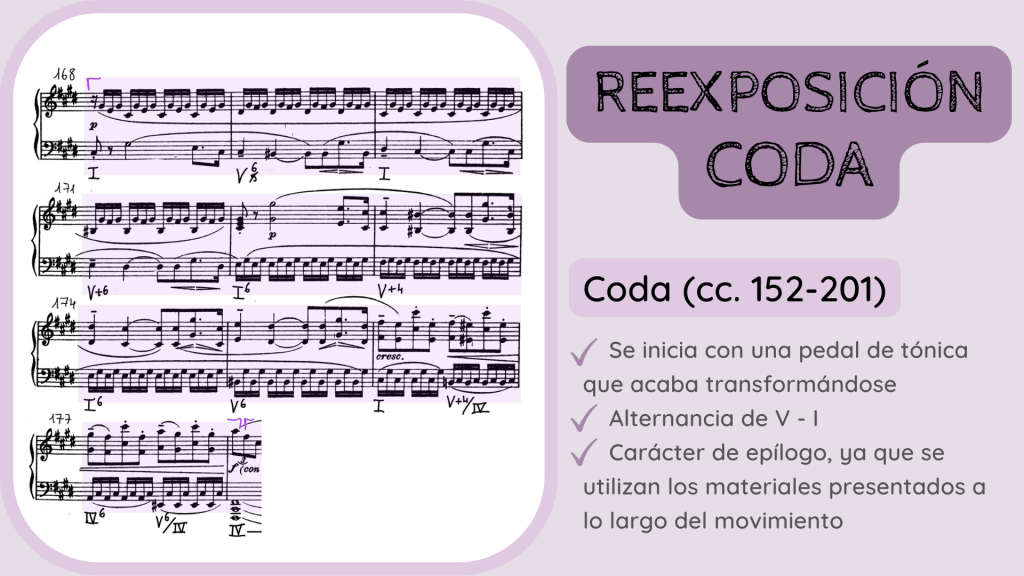 Y aparece por fin la Coda, igual en su inicio que la Sección de Cierre, como suele ocurrir. En esta coda, como nos acostumbrará Beethoven en la mayoría de obras de este periodo, se extiende enormemente. Para Beethoven era importante un equilibrio estructural y el compositor concibe esta coda como el broche final no sólo de este movimiento sino de toda la sonata. La intención de la coda es relajar toda la tensión acumulada. Vamos a ver qué características tiene y cómo está construida esta gran coda que ocupa, en número de compases, un 25% del total del movimiento.