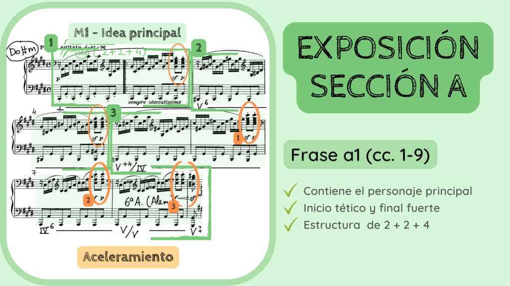 Y así, con un inicio acéfalo, escuchamos el material melódico-rítmico secundario, lo que hemos denominado como b1.