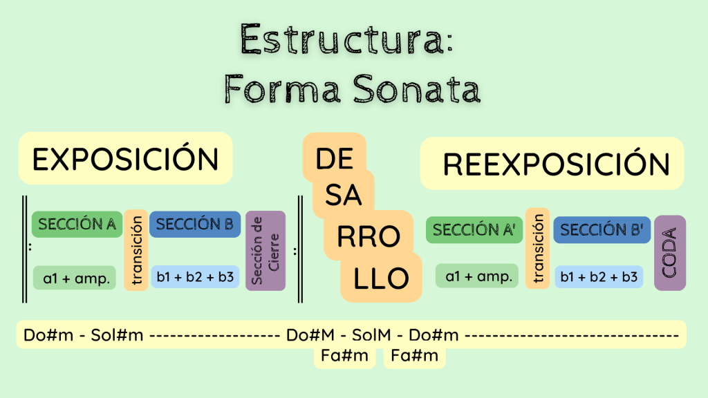 Así termina este análisis, con este esquema que muestra el planteamiento tonal del movimiento. Se trata de una Forma Sonata dividida en sus tres partes: exposición, desarrollo y reexposición. Hemos comprobado que en esta forma Sonata, con un Beethoven ya romántico, la coda ha aumentado considerablemente de tamaño para cerrar toda la sonata. A nivel tonal la obra se reduce, básicamente, a los tres centros tonales, a saber: tónica, dominante en Sol# menor y subdominante en Fa# menor. Destacan dos tonalidades más: por un lado la tonalidad homónima a la principal, Do# Mayor (que no ha sido más que un breve instante para preparar la dominante de Fa# menor) y, con cierto protagonismo, la Región Napolitana de Fa# menor, es decir, Sol Mayor.
